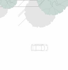 By eliminating large parking spaces and lots, the design prioritizes trees and abundant green space. This also provides a kind of vaulted ceiling on the street that provides protection from the heat.