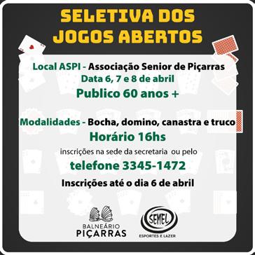 A Secretaria de Esportes e Lazer (Semel) irá promover uma seletiva de idosos para re presentar o município nos Jogos Abertos da Terceira Idade. As disputas serão realizadas em duplas nas modalidades mascu lina e feminina de bocha, domi nó, canastra e truco serão rea lizadas nesta quarta (6), quinta (7) e sexta-feira (8), na Associa ção Sênior de Piçarras (ASPI), a partir das 16h.