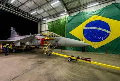 operação. Em um dos hanga res do aeroporto, as aeronaves estão sendo preparadas para decolarem em direção Centro de Ensaios em Voo do Gripen (Gripen Flight and Test Centre – GFTC), na planta da Embra er, em Gavião Peixoto (SP). Os dois aviões fazem parte de um lote de 36 aviões adquiridos pela Força Aérea Brasileira.