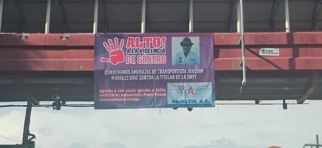 La mañana del lunes, varios puntos de Tapachula amanecieron con mantas que expresan el mensaje “Alto a la Violencia de Género”. Este acto fue llevado a cabo por la organización defensora de los derechos humanos de las mujeres, ANJELTIK A.C., en respuesta a las amenazas y comentarios misóginos del transportista Joaquín Morales Díaz dirigidos hacia la Secretaria de Movilidad y Transportes, Nancy Vences Montiel.