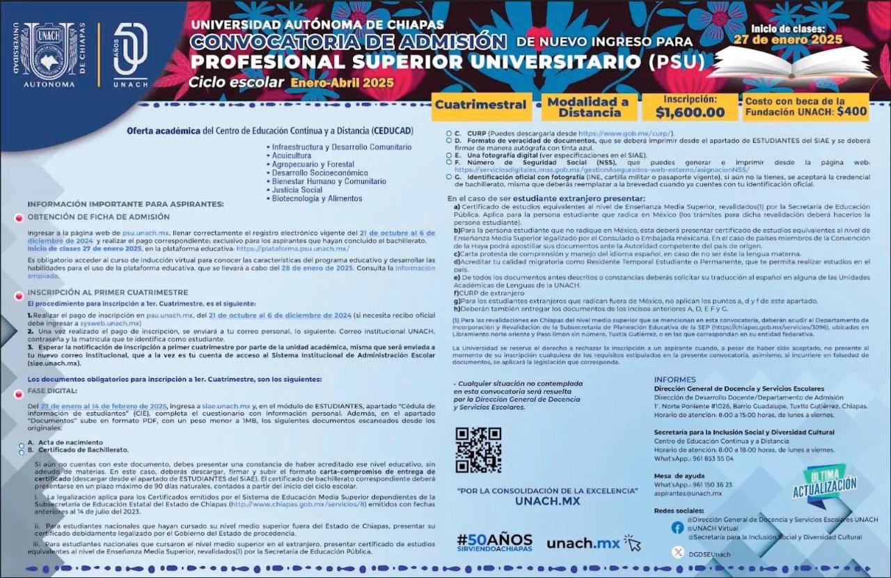 Tuxtla Gutiérrez, Chis., 03 NOV.-La Universidad Autónoma de Chiapas convoca a egresados y egresadas del nivel medio superior, a cursar el Profesional Superior Universitario (PSU), que tiene como propósito formar de manera integral a profesionales que atiendan y resuelvan problemáticas en contextos diversos, priorizando la interacción de saberes, la equidad, la inclusión, el respeto a la diversidad y el bienestar colectivo. En este programa educativo, los aspirantes ingresan sin examen de admisión; sin embargo, todos debe-