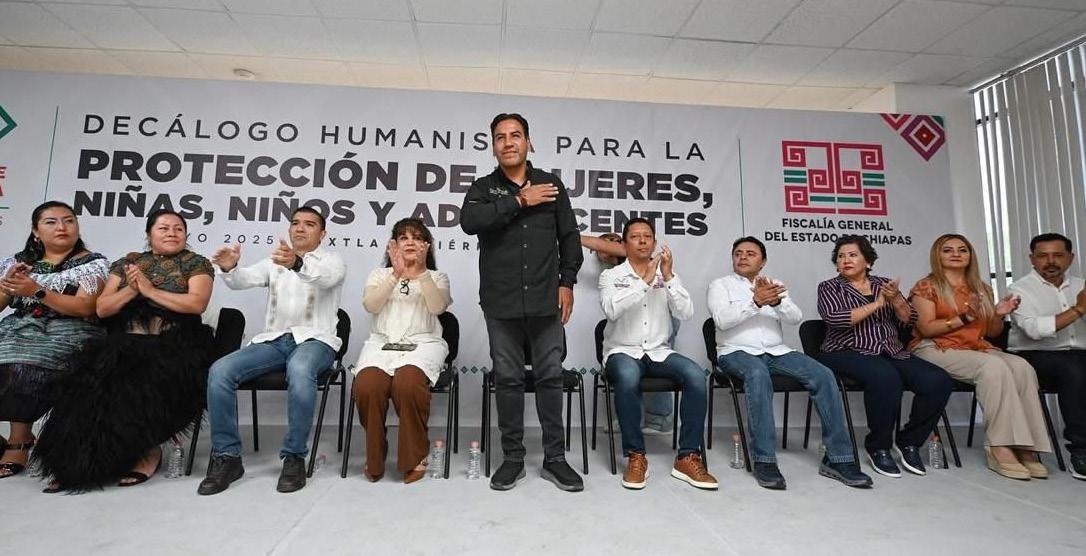 El gobernador Eduardo Ramírez Aguilar participó en el Decálogo Humanista para la Protección de Mujeres, Niños, Niñas y Adolescentes, donde reafirmó su compromiso de combatir de manera decidida la violencia contra estos sectores, atendiendo las causas estructurales de los delitos que más afectan a Chiapas en esta materia.