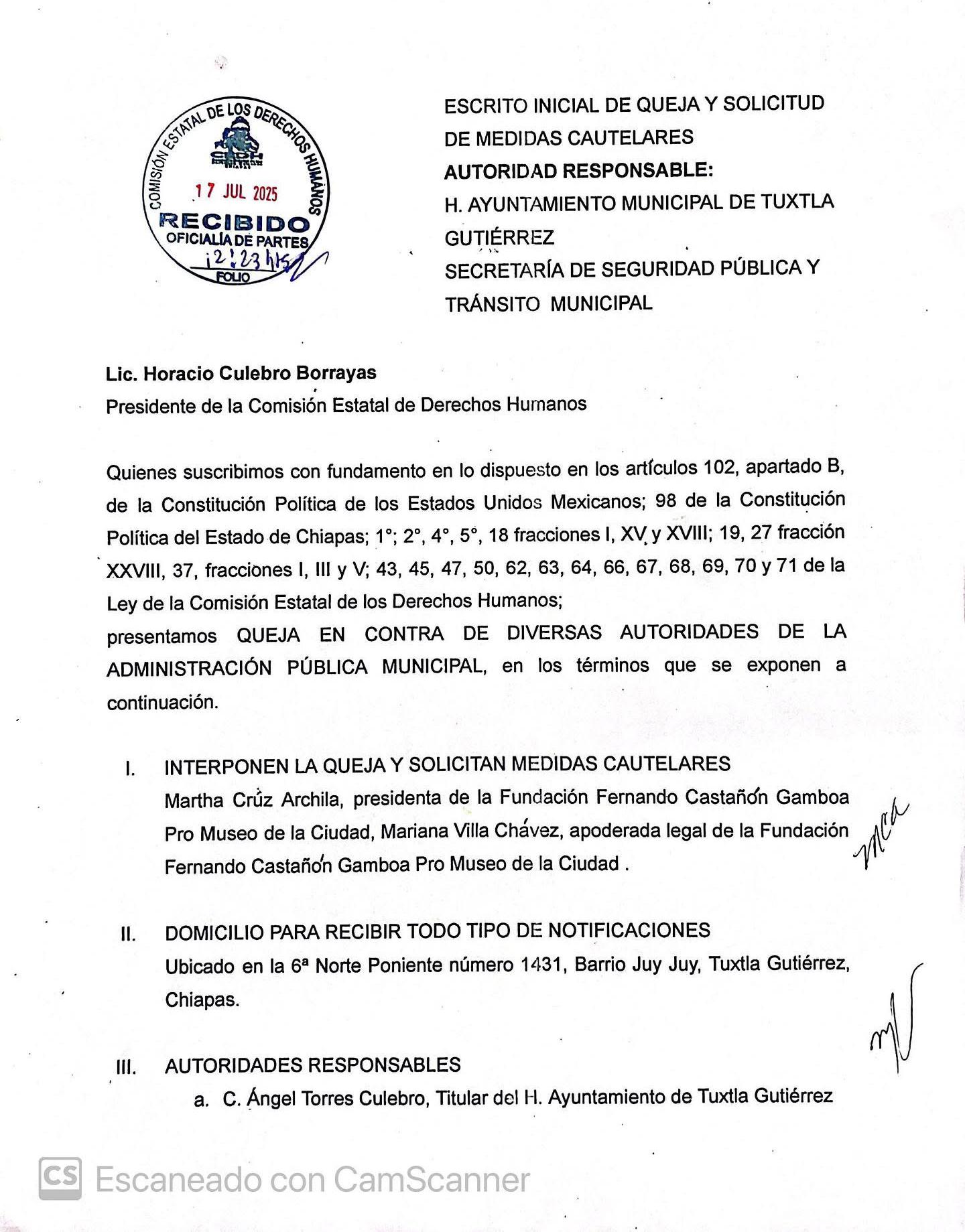 La Fundación Fernando Castañón Gamboa Pro Museo de la Ciudad presentó una queja formal ante la Comisión Estatal de Derechos Humanos (CEDH) en contra del Ayuntamiento de Tuxtla Gutiérrez y la Secretaría de Seguridad Pública Municipal, por presuntas violaciones a los derechos culturales de la ciudadanía, particularmente de personas adultas mayores.