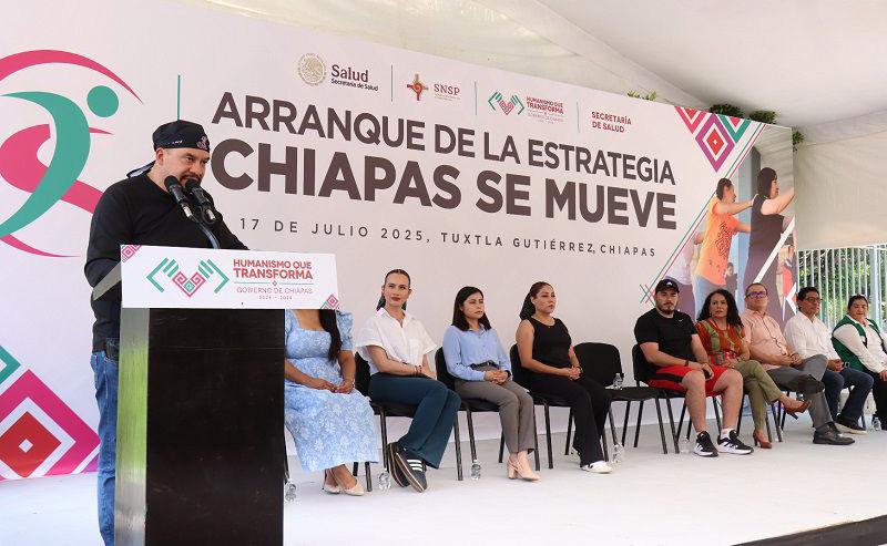 Tuxtla Gutiérrez, Chiapas; 17 de julio de 2025.- Con el apoyo de las secretarías de Educación y de Infraestructura, el secretario de Salud, Omar Gómez Cruz, puso en marcha la estrategia “Chiapas se mueve”, cuya meta es crear hábitos saludables en las y los trabajadores de los tres niveles de gobierno, a través de la alimentación y activación física, para prevenir y controlar las enfermedades crónicas degenerativas, como obesidad e hipertensión, y de esta manera poner el ejemplo para que la población en general se sume a este movimiento por un Chiapas más sano.