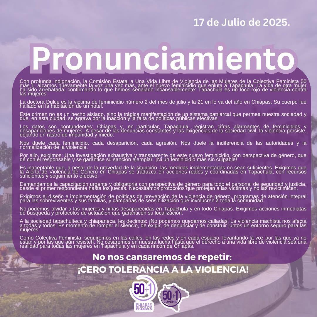 Violencia de las Mujeres de 50+1 Chiapas difundió un pronunciamiento en el que exigió una investigación con perspectiva de género y acciones urgentes ante la Alerta de Violencia de Género.