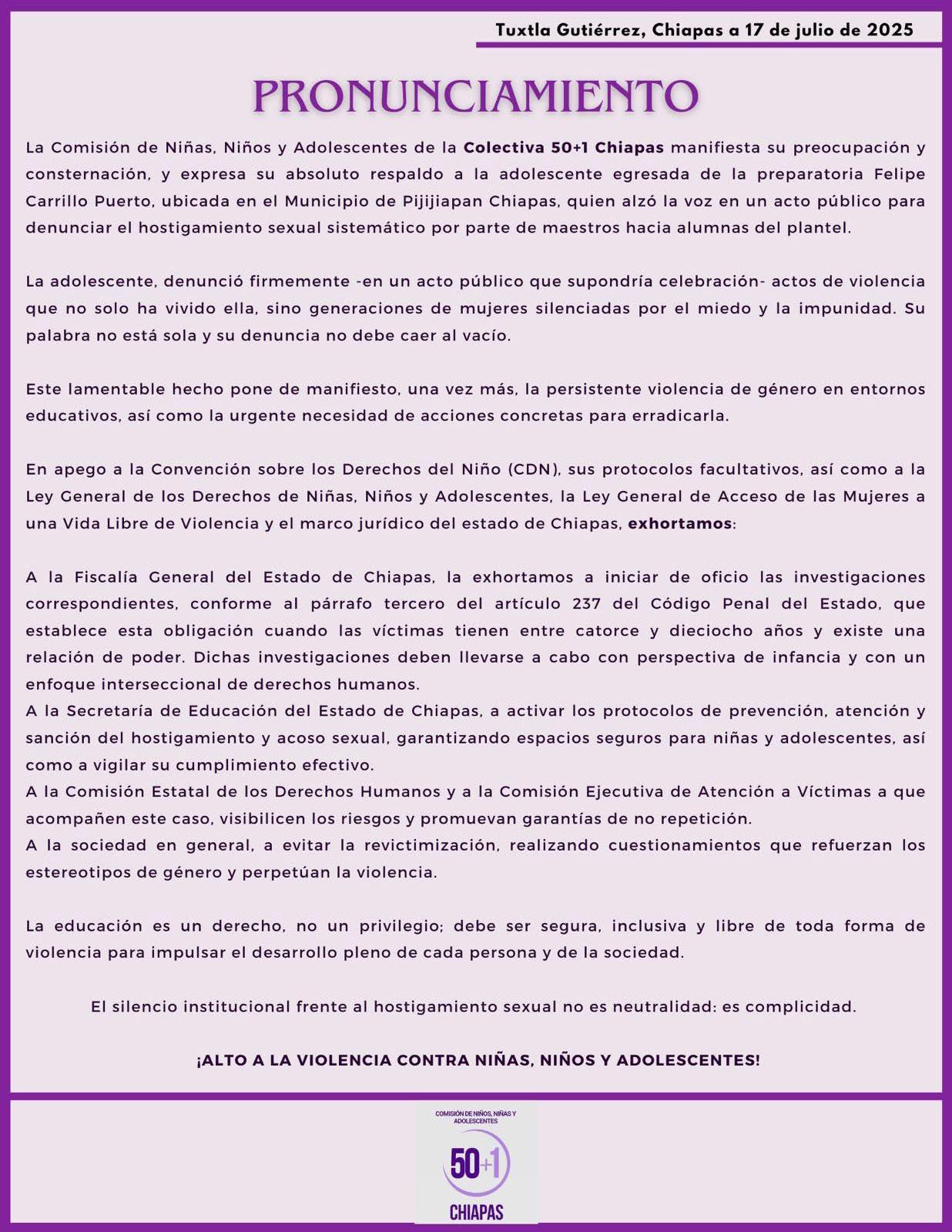 La colectiva 50+1 Chiapas, a través de su Comisión de Niñas, Niños y Adolescentes, expresó su respaldo a una adolescente egresada de la preparatoria Felipe Carrillo Puerto, en el municipio de Pijijiapan, quien denunció públicamente el hostigamiento sexual sistemático por parte de maestros hacia alumnas del plantel.