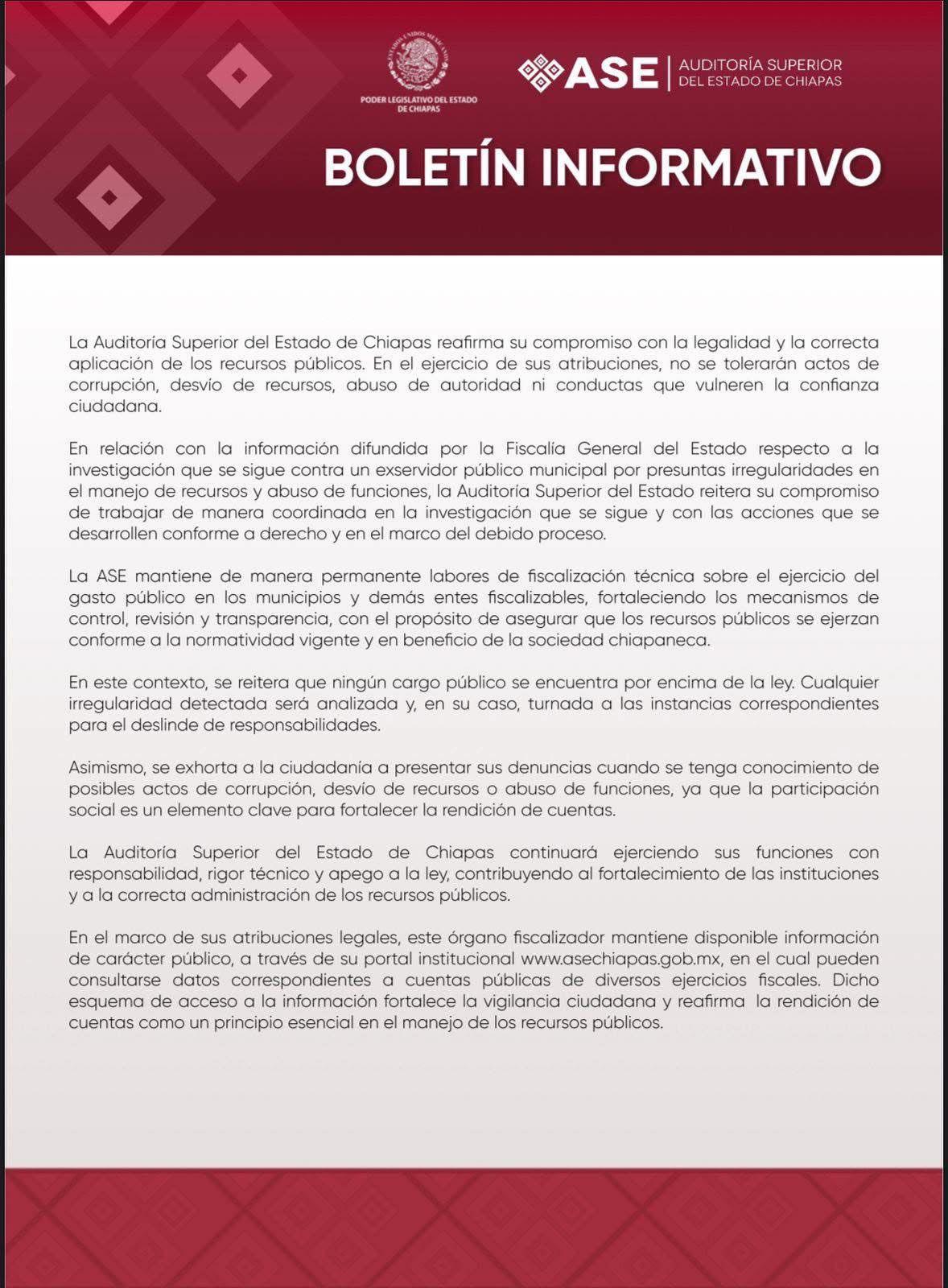 Por su parte, la Auditoría Superior del Estado (ASE) de Chiapas reafirmó su compromiso con la legalidad y la correcta aplicación de los recursos públicos. El órgano fiscalizador señaló que, en el ejercicio de sus atribuciones, no se tolerarán actos de corrupción, desvío de recursos ni abusos de autoridad que vulneren la confianza ciudadana.