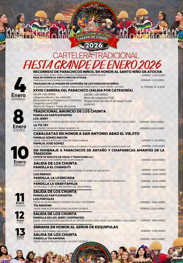 La Fiesta Grande de Enero se realiza del 8 al 23 de enero y es considerada una de las celebraciones más antiguas y representativas de Chiapas. Está reconocida por la Unesco como Patrimonio Cultural Inmaterial de la Humanidad y concentra cada año actividades religiosas, danzas rituales, desfiles y eventos gastronómicos.
