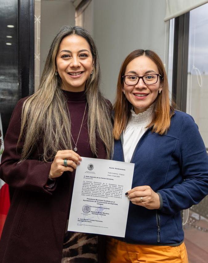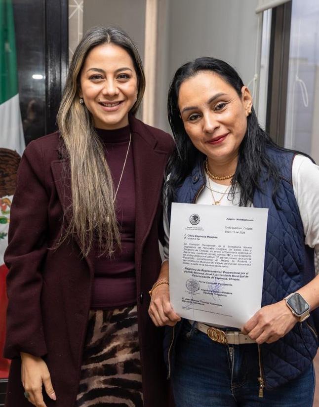 Tuxtla Gutiérrez, Chiapas; 15 de enero de 2025.- La diputada Alejandra Gómez Mendoza, presidenta de la Mesa Directiva del Congreso del Estado, entregó nombramientos a las ciudadanas Nidia Alejandra De los Santos Sarmiento, como presidenta municipal sustituta y a la ciudadana Olivia Espinosa Mendoza como regidora de representación proporcional por el Partido Movimiento Regeneración Nacional, del Ayuntamiento de Ocozocoautla de Espinoza, Chiapas. Lo anterior, al declararse la au-