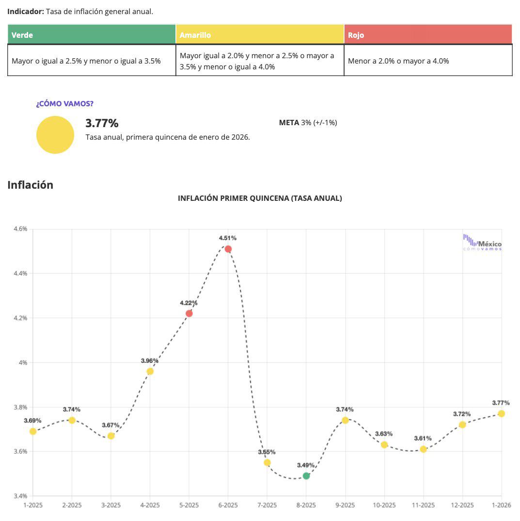 La inflación en México inició 2026 con una aceleración moderada, al ubicarse en 3.77 por ciento anual durante la primera quincena de enero, de acuerdo con datos publicados por el Instituto Nacional de Estadística y Geografía (Inegi).