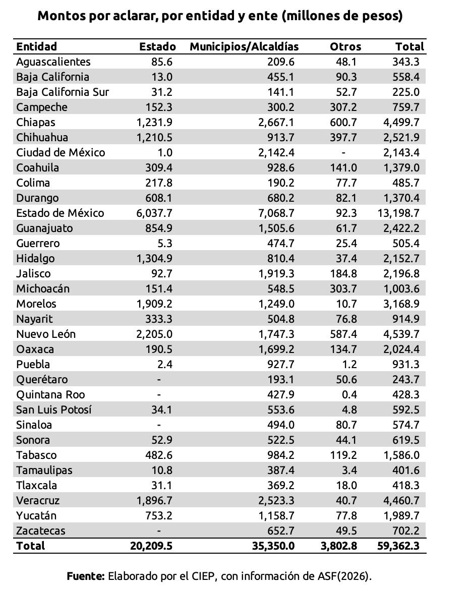 Entre las entidades con mayores montos observados se encuentran el Estado de México, con más de 6 mil millones de pesos; Veracruz, con más de 5 mil 800 millones; así como Chiapas, Oaxaca, Guerrero y Michoacán. También destacan Petróleos Mexicanos y la Secretaría de Infraestructura, Comunicaciones y Transportes por montos relevantes en el ámbito federal.