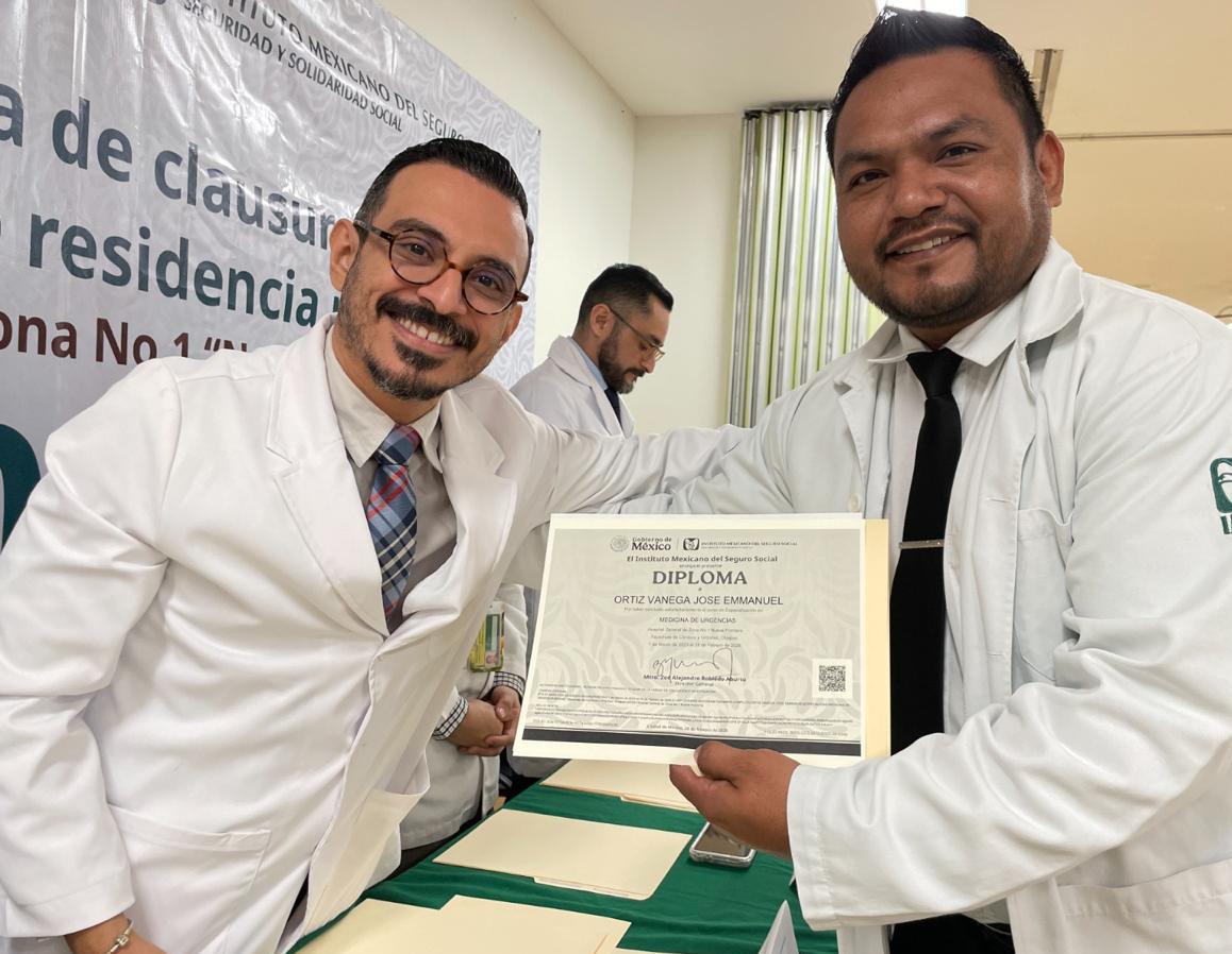 El Instituto Mexicano del Seguro Social (IMSS) en Chiapas concluyó la formación de 36 médicas y médicos especialistas en el Hospital General de Zona (HGZ) No. 1 “Nueva Frontera”, en Tapachula, con lo que fortalece la atención hospitalaria en la entidad.