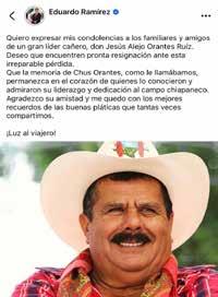 El gobernador de Chiapas, Eduardo Ramírez Aguilar, expresó ayer martes sus condolencias por el fallecimiento del líder cañero Jesús Alejo Orantes Ruíz, a quien se refirió como “Chus Orantes”. A través de sus redes sociales, el mandatario envió un mensaje de solidaridad a familiares y amigos, destacó su liderazgo y dedicación al campo chiapaneco, y agradeció la amistad que compartieron. “¡Luz al viajero!”, concluyó en su publicación.