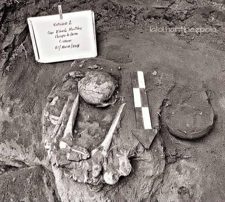 este preciso jardín se encontraron vestigios arqueológicos. Don Lalo nos narró que se hallaron ofrendas y dos personas en posición fetal divididas por una laja cuadrada a 50 cm del piso. Las vasijas encontradas eran las clásicas chiapanecas, redondas con tres patitas de bola. Uno de los cuerpos hallados, como dato curioso, tenía problemas de columna según la arqueóloga en-