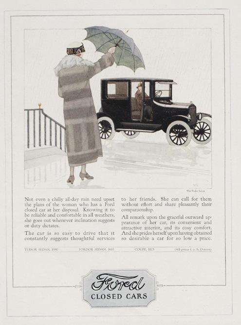 Campaña realizada en Vanity Fair, revista estadounidense de cultura, moda y política, publicada mensualmente entre 1913 y 1936. Mostramos las primeras publicidades a color sobre el Modelo T. Los modelos con carrocería cerrada en versiones Tudor Sedan, Fordor Sedan y Coupe, fueron promocionados para el uso de la moderna mujer americana.