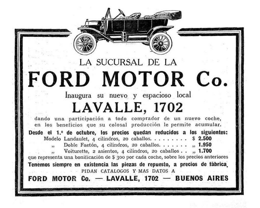 Campaña realizada en la revista argentina Caras y Caretas, una de las revistas más populares de nuestro país. La filial de Ford Motor Company en la Argentina se creó en 1913 y comenzó sus actividades comerciales al año siguiente. Estas publicidades corresponden a su segundo local ubicado en la esquina de Lavalle y Rodríguez Peña, edificio que se puede ver en la actualidad tal como era por entonces. Es de destacar que se ofrece el Modelo T en todas sus versiones pero nunca se lo promociona por su nombre, era simplemente el Ford.