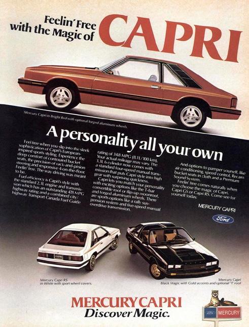 Campaña realizada en MacLeans, la única revista de noticias nacional de Canadá, fundada en 1905 por el editor canadiense John Bayne Maclean. Se llamó inicialmente The Business Magazine, en 1911 la revista pasó a llamarse MacLean’s y la “L” mayúscula desapareció en 1931. Durante los últimos tres meses del año 1980 Ford promociona sus modelos Escort, Granada, Thunderbird y Mustang. El Capri, comercializado dentro de la división Mercury, fue muy popular.
