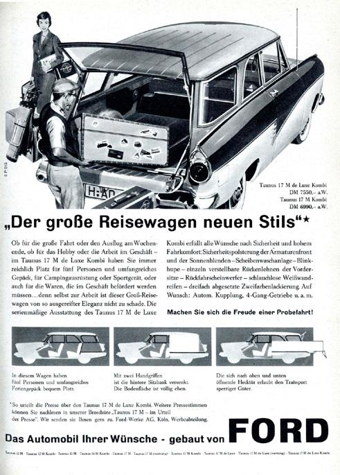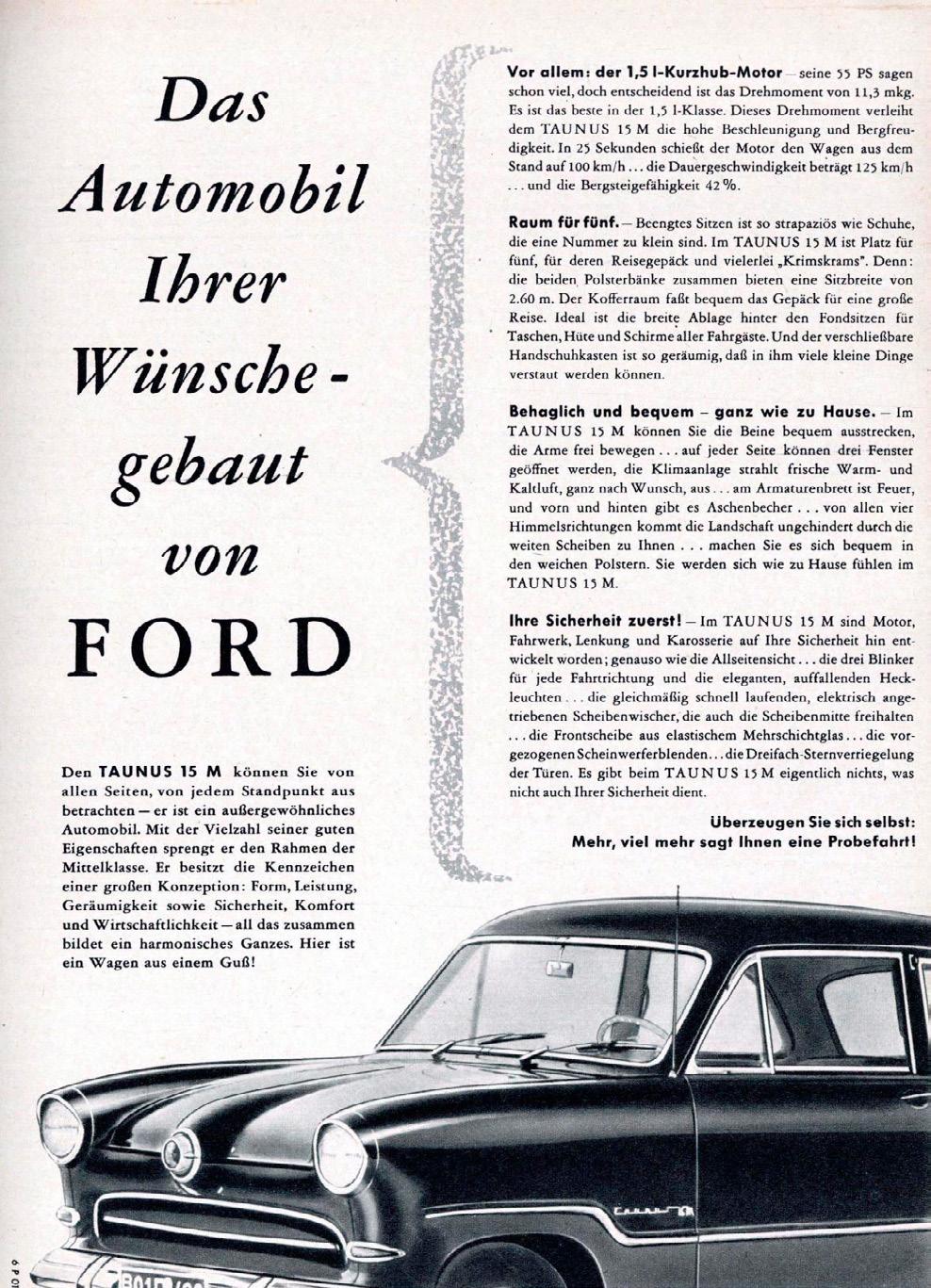 Campaña realizada en Auto Motor und Sport, una revista automovilística alemana de amplio alcance y aparición quincenal, que se publica desde 1946 y es producida por la editorial Motor Presse Stuttgart en Stuttgart. Durante 1956 el modelo que se promocionaba era el Taunus y aquí vemos a los modelos 15M y 17M.