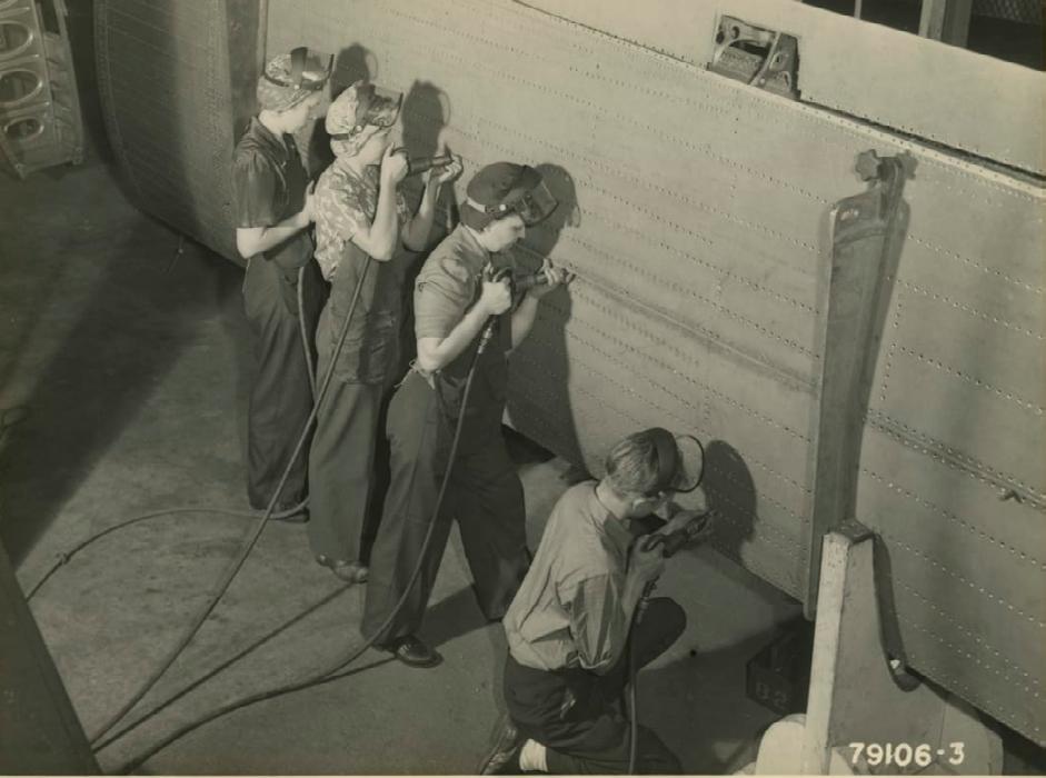 Foto tomada el 16 de diciembre de 1943 en la que se ve a mujeres aprendiendo a remachar en Highland Park Trade School, Highland Park, Michigan. Henry Ford fue un pionero de la educación. Él creía que las habilidades