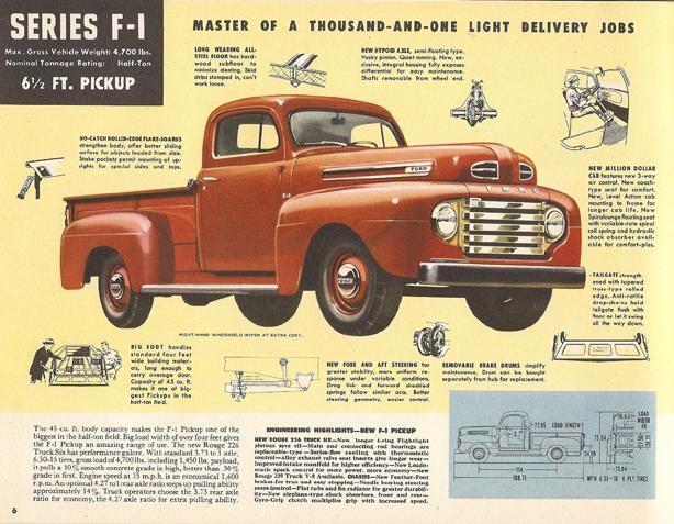 La Serie F, conocida como Ford Bonus-Built, se presentó en 1948 como reemplazo de la línea anterior de camionetas basadas en automóviles presentada en 1942. Al principio se vendió en ocho clasificaciones de peso diferentes, como pick--up, camiones de paneles, motores con cabina sobre el motor (COE), camiones convencionales y estilos de carrocería con chasis de autobús escolar.