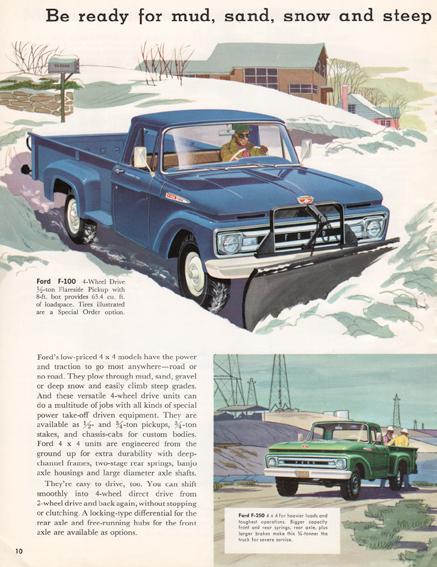 Ford introdujo un estilo de camioneta radicalmente nuevo en 1961. Más largas y bajas que sus predecesoras, estas camionetas tenían mayores dimensiones y nuevas opciones de motor y caja de cambios. En 1965, la Serie F recibió un importante rediseño a mitad de ciclo. Se introdujo una plataforma completamente nueva, incluida la suspensión delantera "Twin I-Beam", y se siguió utilizando hasta 1996 en la F-150, y todavía se encuentra actualmente en la F-250 y la F-350 4x2.