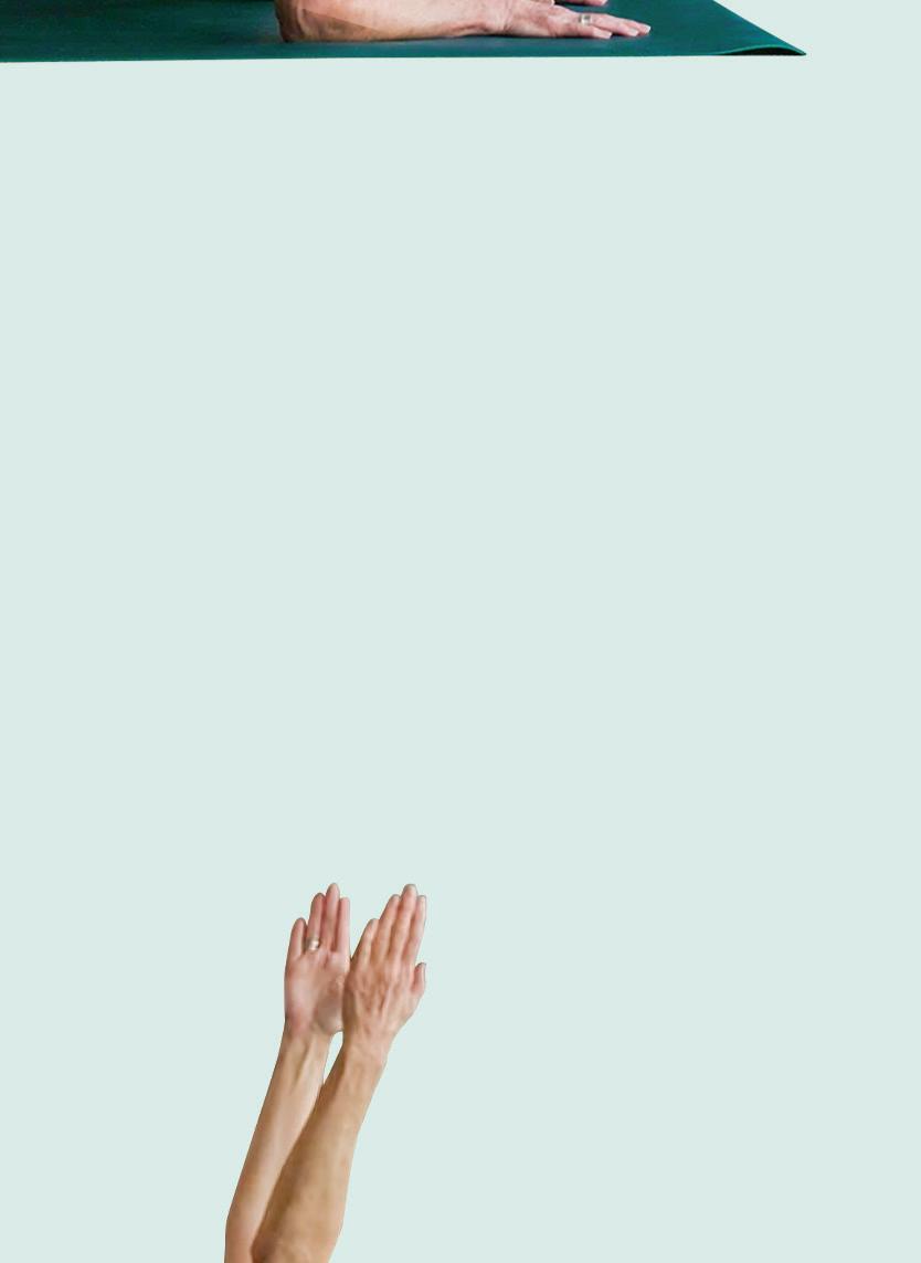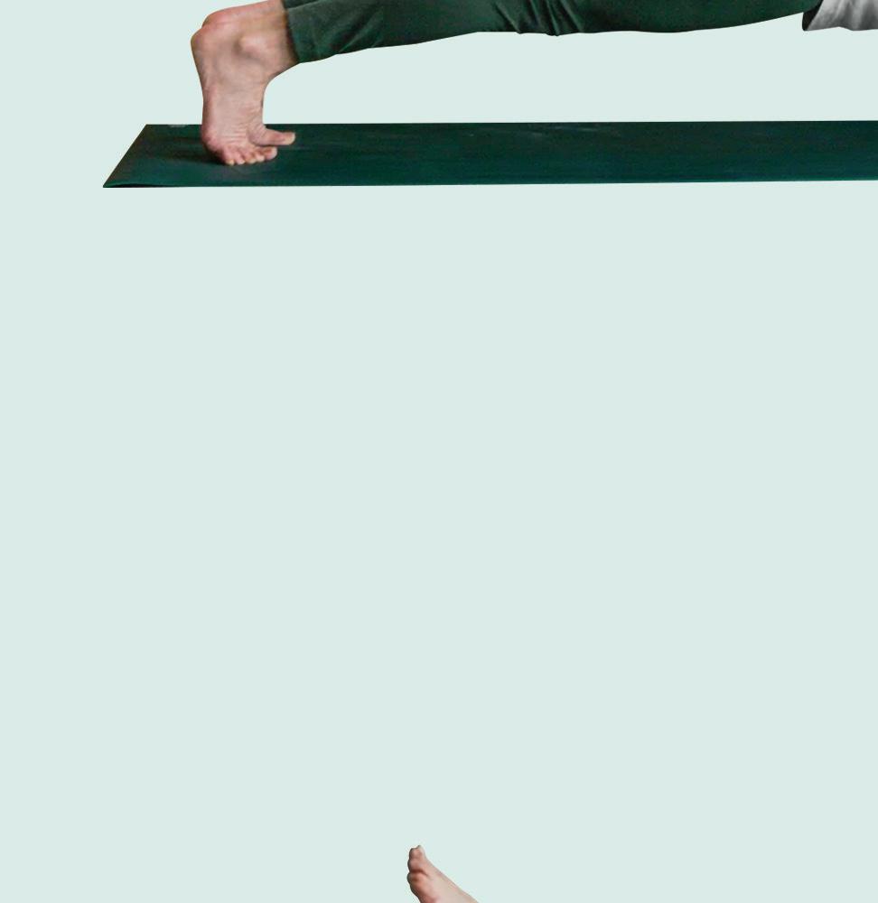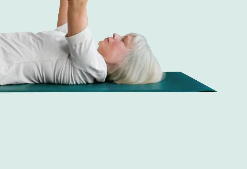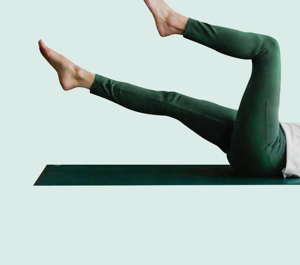 Lie on your back and imagine a small piece of paper under your lower spine. Gently press your back down to “smush” it and feel your abdominals engage. Lift your legs, knees bent over hips, arms up. Straighten one leg and the opposite arm, then return and switch sides. Keep your back pressing down and alternate for up to one minute.