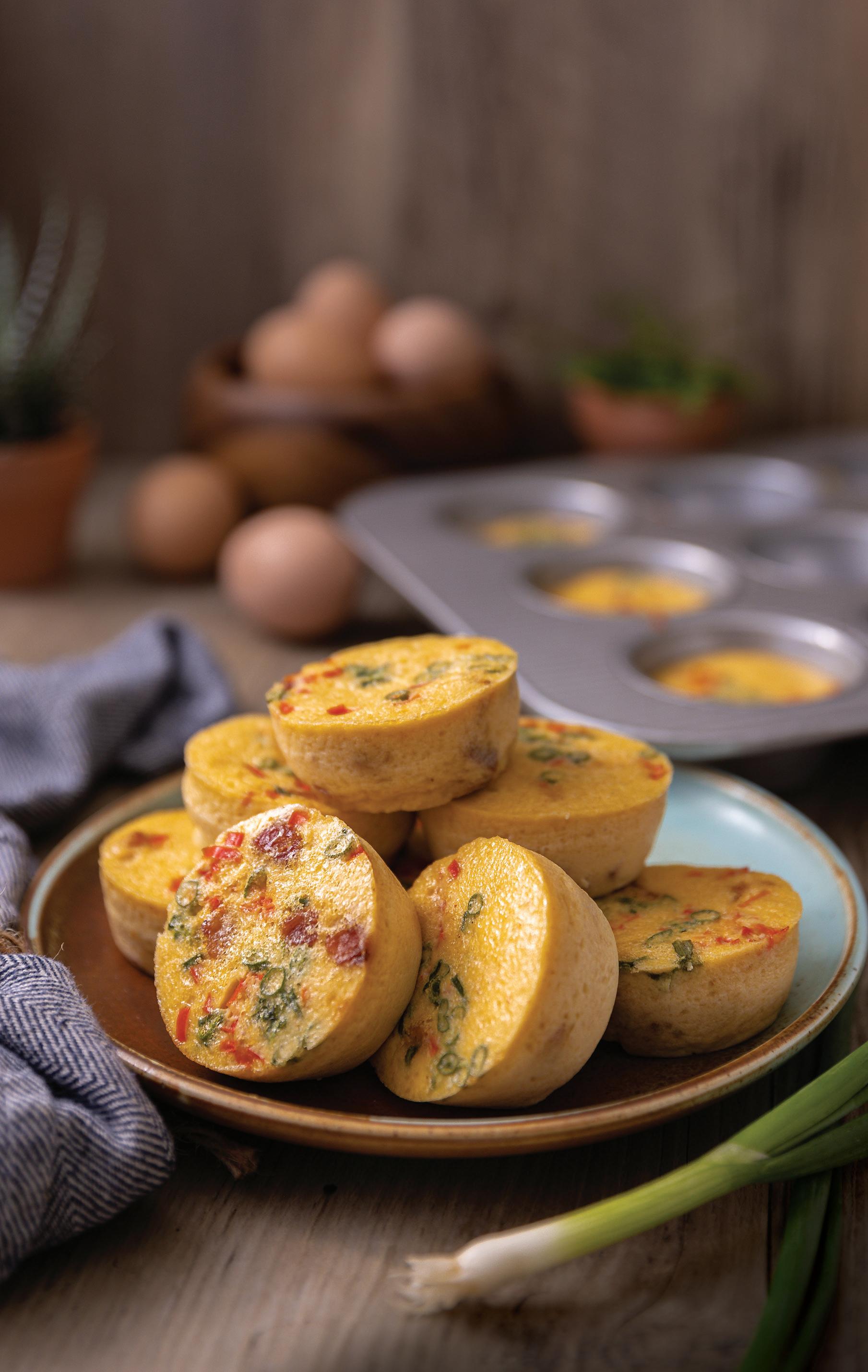 4. Pour the egg mixture into the 12 muffin tins. Top with turkey bacon, red peppers and scallions.