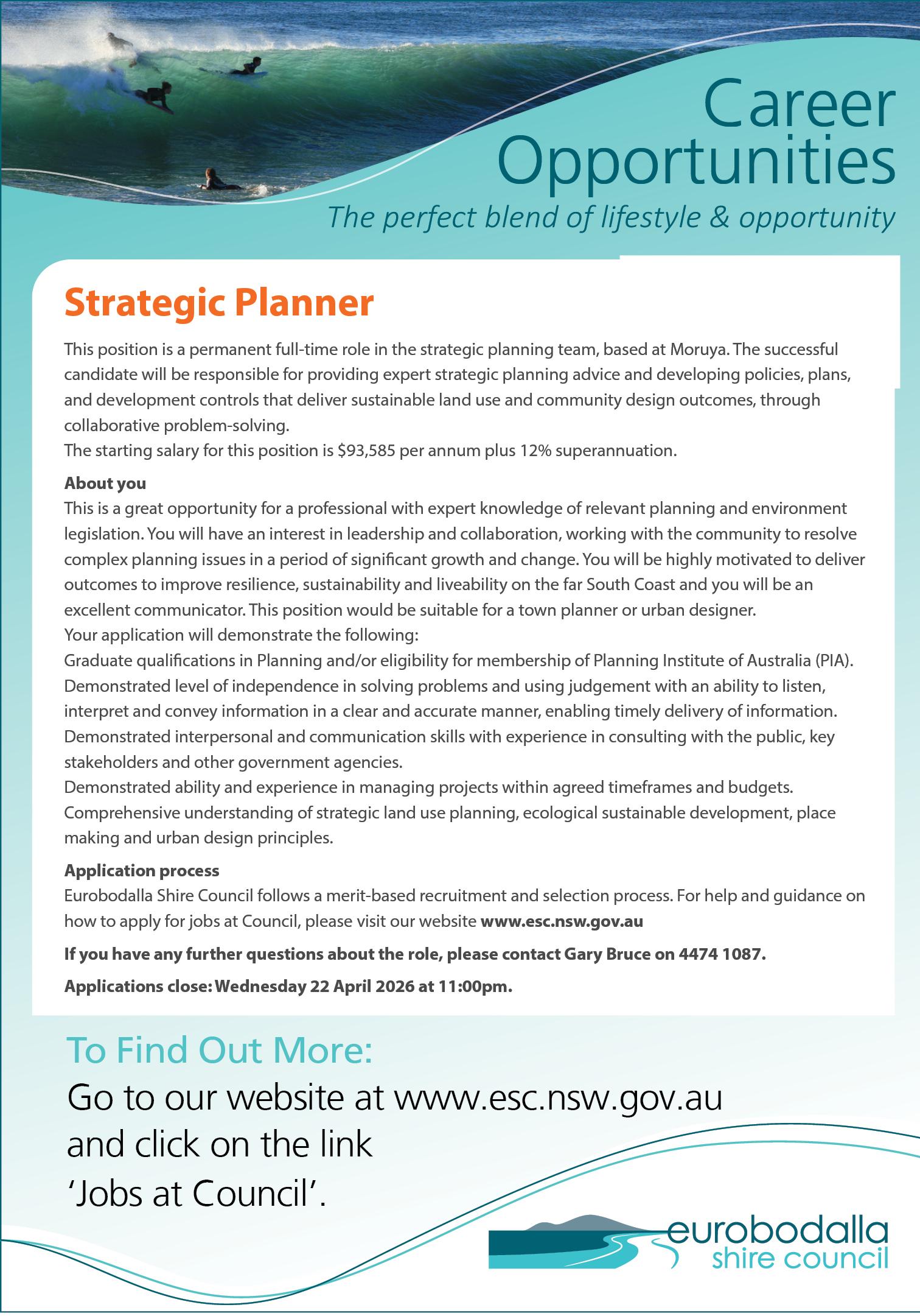 For further information about the Glamorgan Spring Bay Council and to obtain a copy of the position description please go to gsbc.tas.gov.au/council/employment