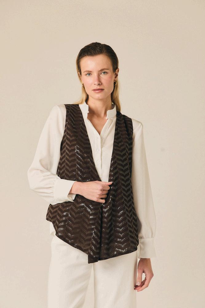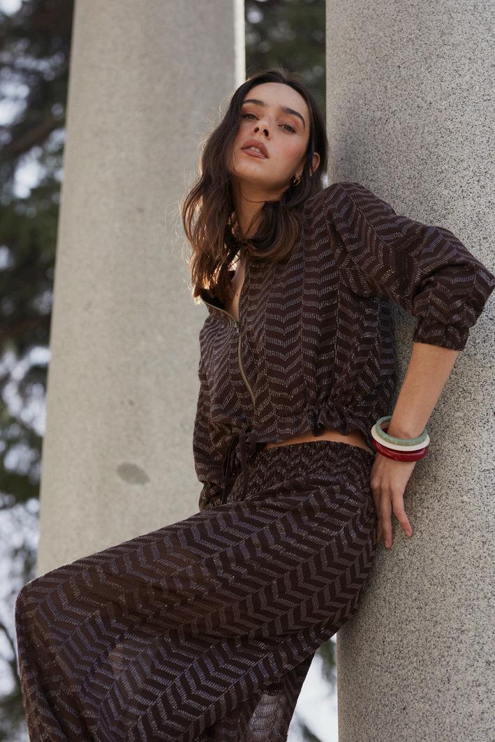 Las texturas con relieve y los efectos ligeramente metalizados aportan profundidad sin exceso Combinadas con pantalones amplios o siluetas bombachas, crean un equilibrio entre sofisticación y comodidad.