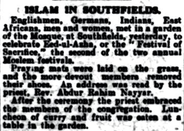 “Englishmen, Germans, Indians, East Africans, men and women, met in a garden of the Mosque, at Southfields, yesterday, to celebrate Eed-ul-Azha, or the ‘Festival of Sacrifice,’ the second of the two annual Moslem festivals.