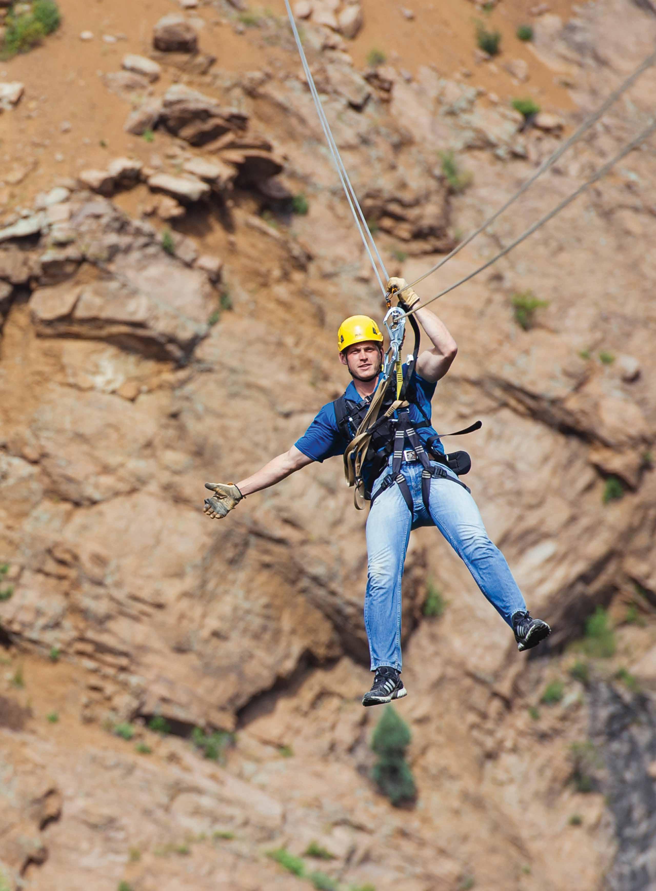 THE BROADMOOR SOARING ADVENTURE IS A THRILLING excursion that lets guests experience the stunning natural scenery of Cheyenne Canyon from a unique perspective on zip lines ranging in length from 250 to 1,800 feet, with some moderate hiking. Start your adventure at Broadmoor Outfitters’ Base Camp, where you’ll be transported to the start of the course. Participants are fitted with top-of-the-line gear and receive extensive instruction on a practice zip line. Participants must weigh at least 90 pounds and no more than 250 pounds, and they are accompanied by two experienced guides at all times.