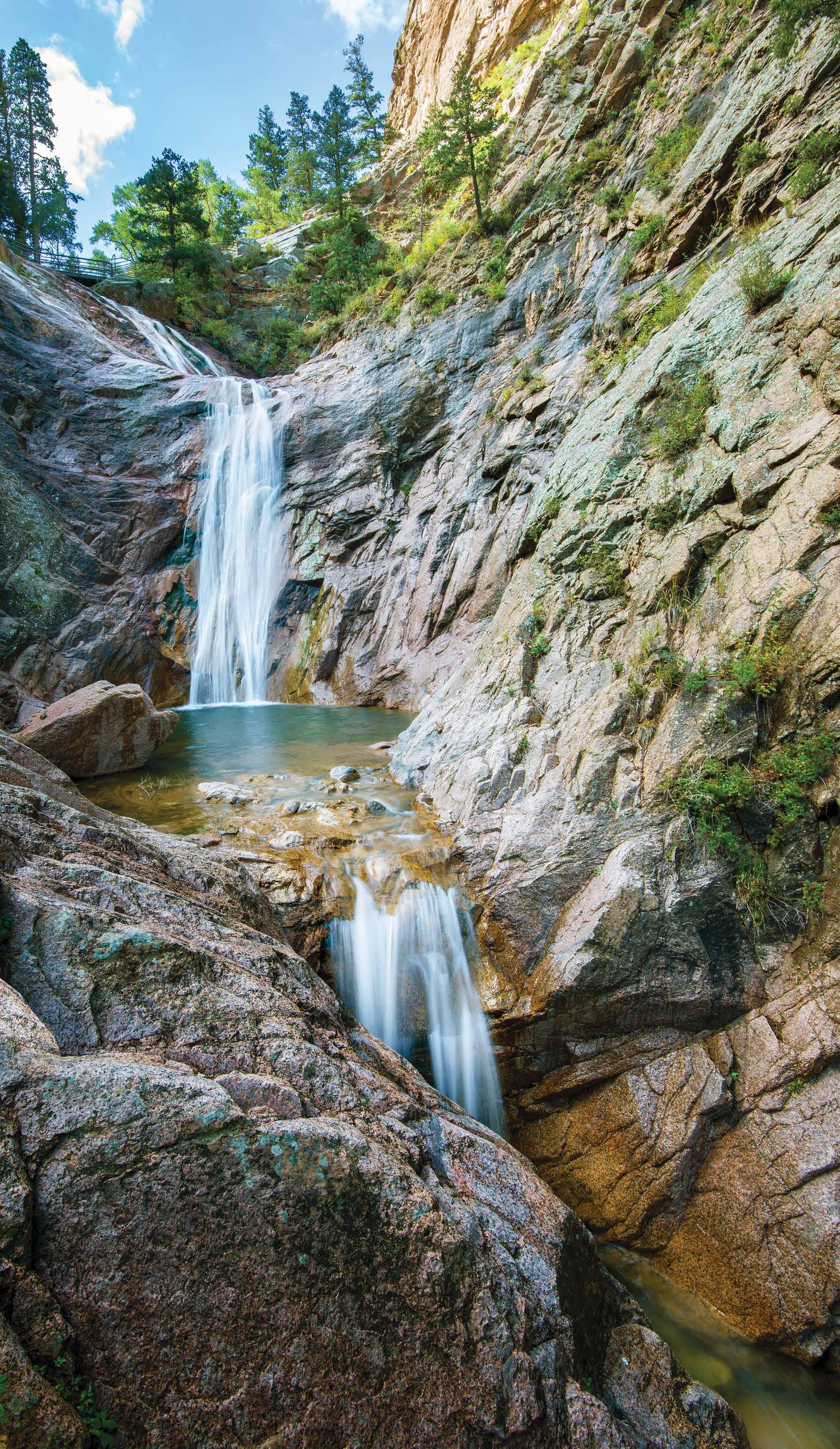 ON MARCH 9, 1883, COLORADO HOMESTEADER NATHANIAL COLBY BEGAN welcoming guests to Seven Falls. Visitors could hike into the scenic canyon for ten cents a person and picnic at the foot of a magnificent seven-tiered waterfall. A stairway to the top was added a few years later, along with a road, and visitors arrived on foot, on horseback, and in carriages to see what’s now known as the “grandest mile in Colorado.”