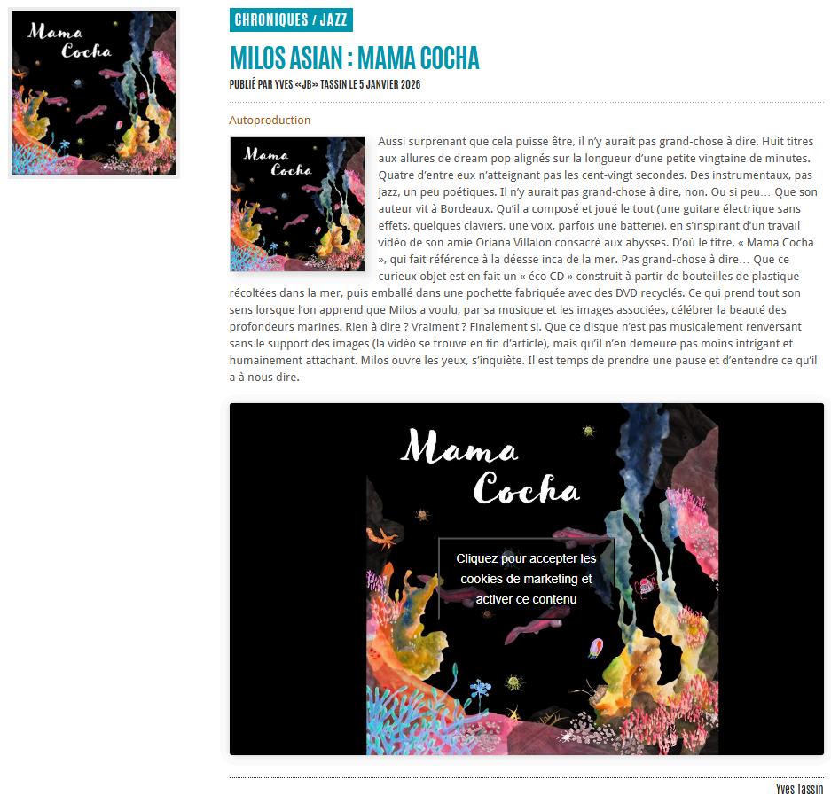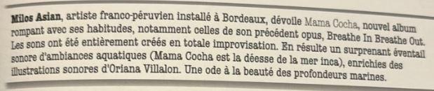 Écouter Mama Cocha, c'est accepter de se laisser traverser par la mer C'est se souvenir que sous la surface calme, il y a des mondes agités, des récits d'ombre et de lumière, des fragilités et des forces. Milos Asian ne nous propose pas seulement de contempler la mer, il nous invite à sentir son rythme, à respirer son silence, à comprendre que chaque onde porte une histoire Et dans ce silence vibrant, on entend le murmure de la conscience, l'écho de la planète, et la poésie d'un monde qui existe autant en nous qu'en dehors de nous