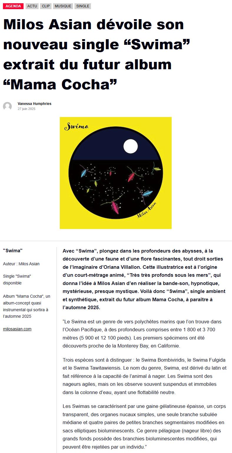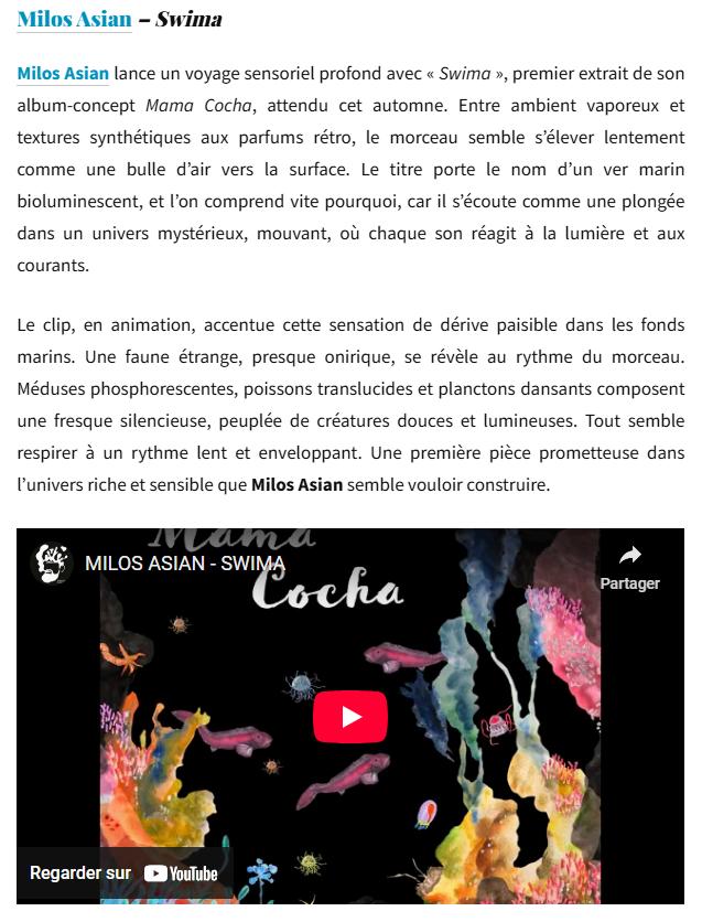 Il y a dans Mama Cocha, dernier album de Milos Asian, quelque chose qui dépasse la simple écoute C'est une immersion totale, un plongeon dans un monde où le son devient matière, où chaque note se transforme en flux, en marée, en courant qui vous emporte Dès l'ouverture avec Doggerland, on ressent cette sensation d'un territoire englouti, mémoire d'une terre perdue, fantôme sonore que l'artiste ressuscite avec des textures électroniques floues, mi-humides, mi-lumineuses Le morceau n'annonce pas seulement un voyage musical : il trace une cartographie de l'inconscient marin, où chaque motif mélodique est un écho des profondeurs