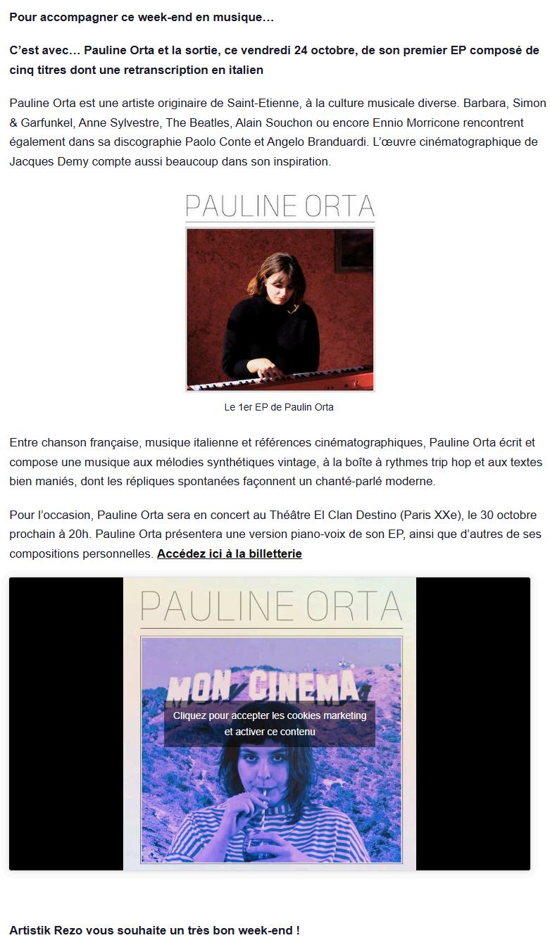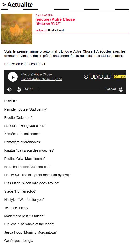 Diffusion du single Mon Cinéma sur Studio Zef (41) lors de l’émission (Encore) Autre Chose #163