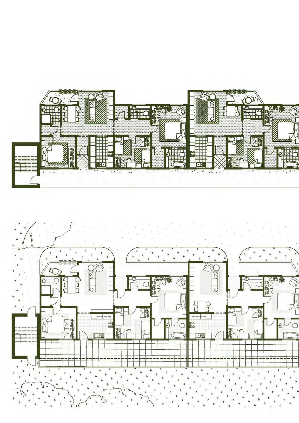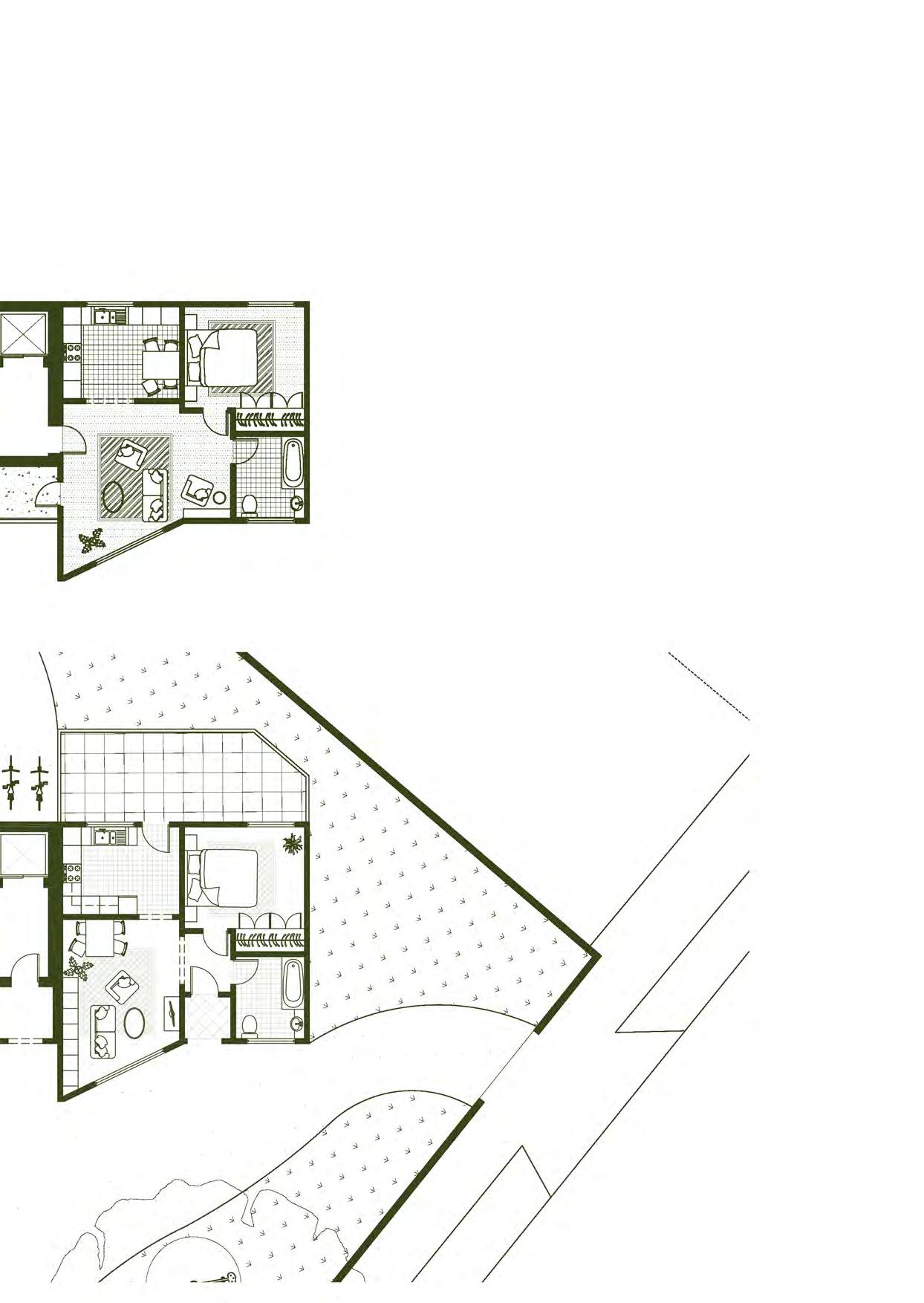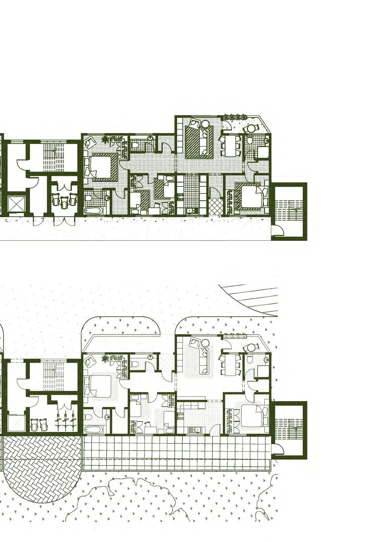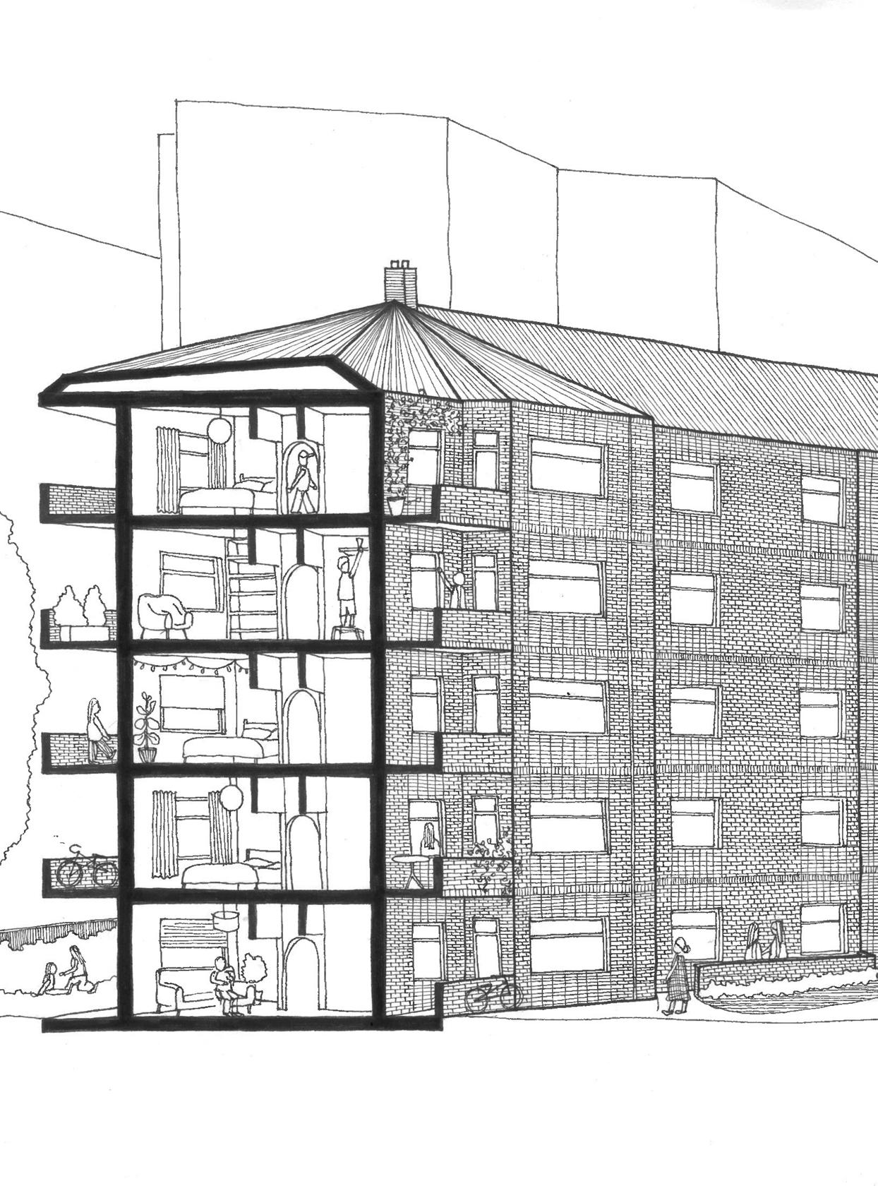 Apartments are designed as closed systems that can be stacked vertically and horizontally next to each other. They do not need to interact.