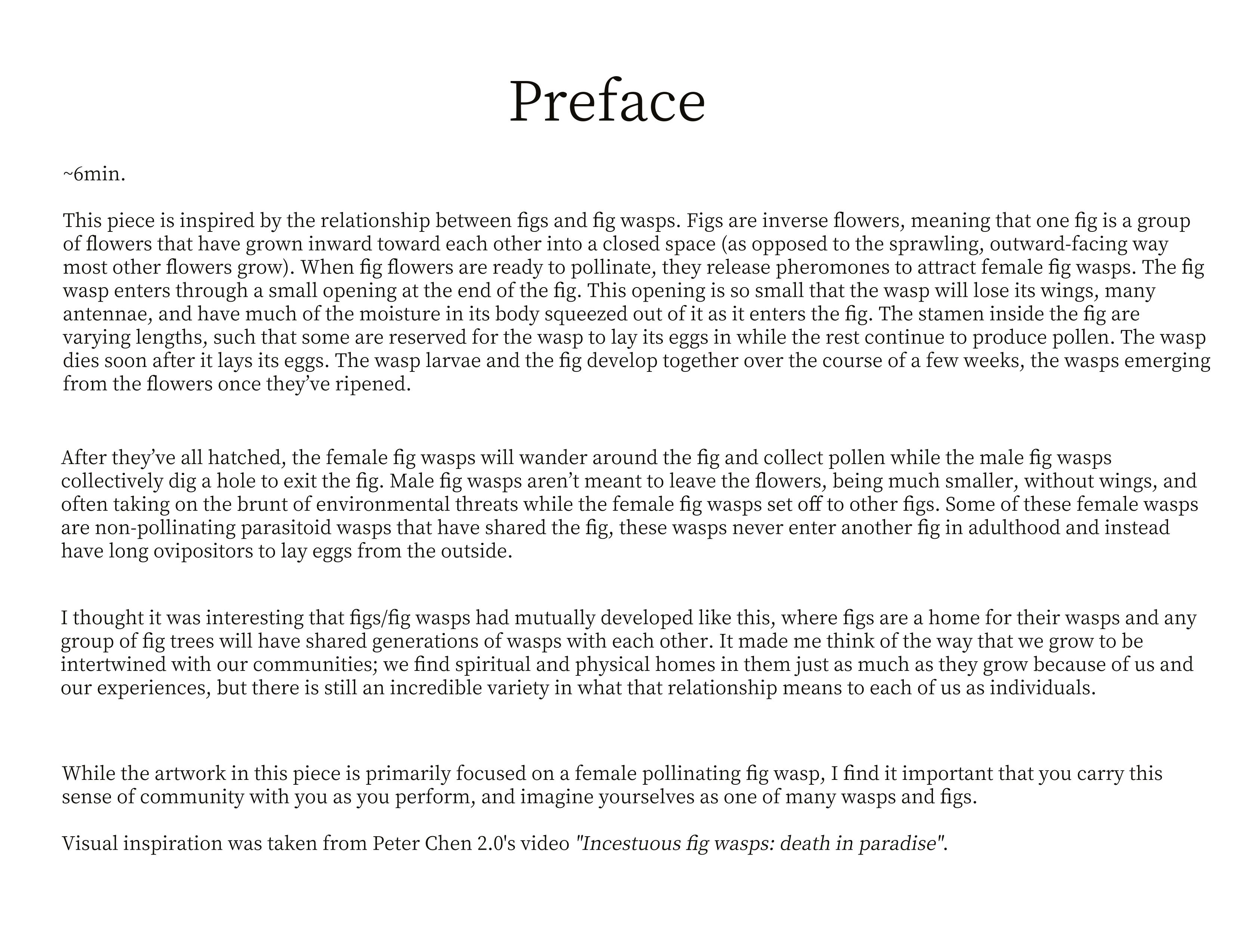Flowering Wasps was inspired by the relationship between figs and fig wasps, and how it compares to the contrasting - yet deeply intertwined - relationships that we have with our own communities.