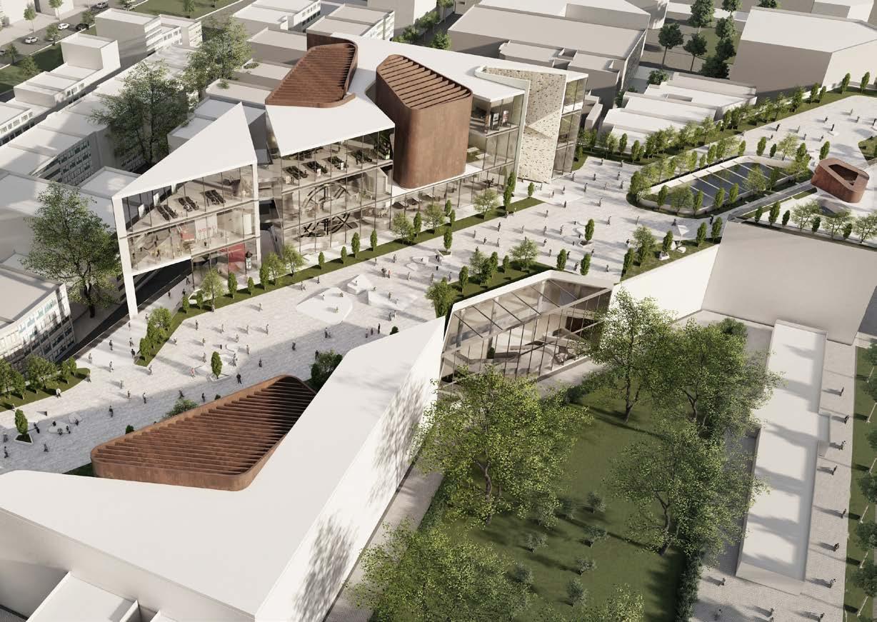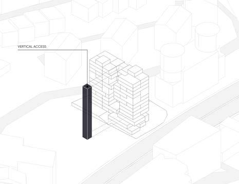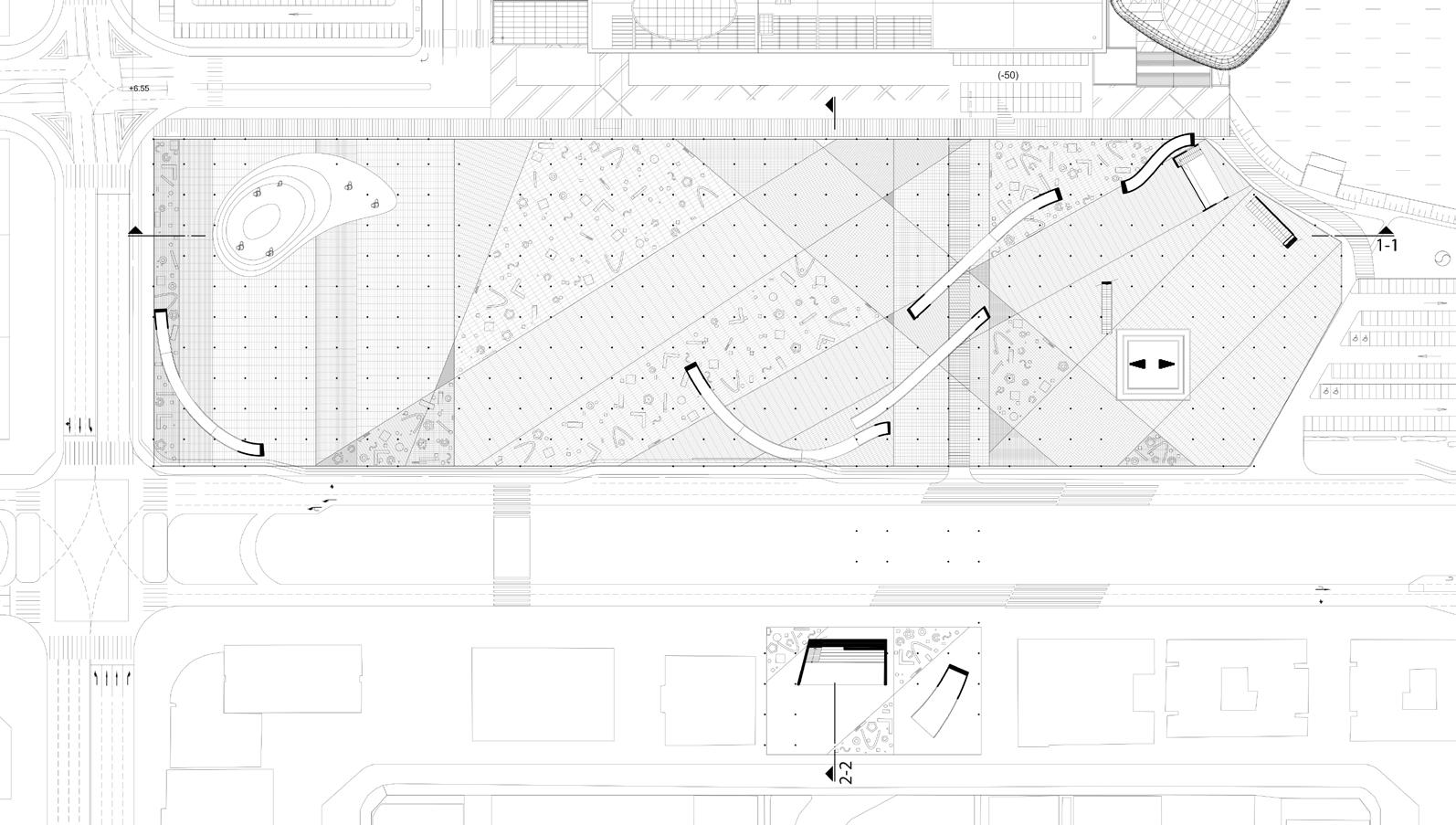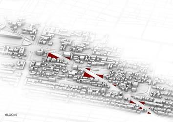 The longitudinal axis of the project is divided into a series of smaller blocks welded to each other on a higher level and informed an elongated street. On the borderlines of the road and each block, interstitial areas functioning as several micro-plazas are generated through the subtraction of void spaces.