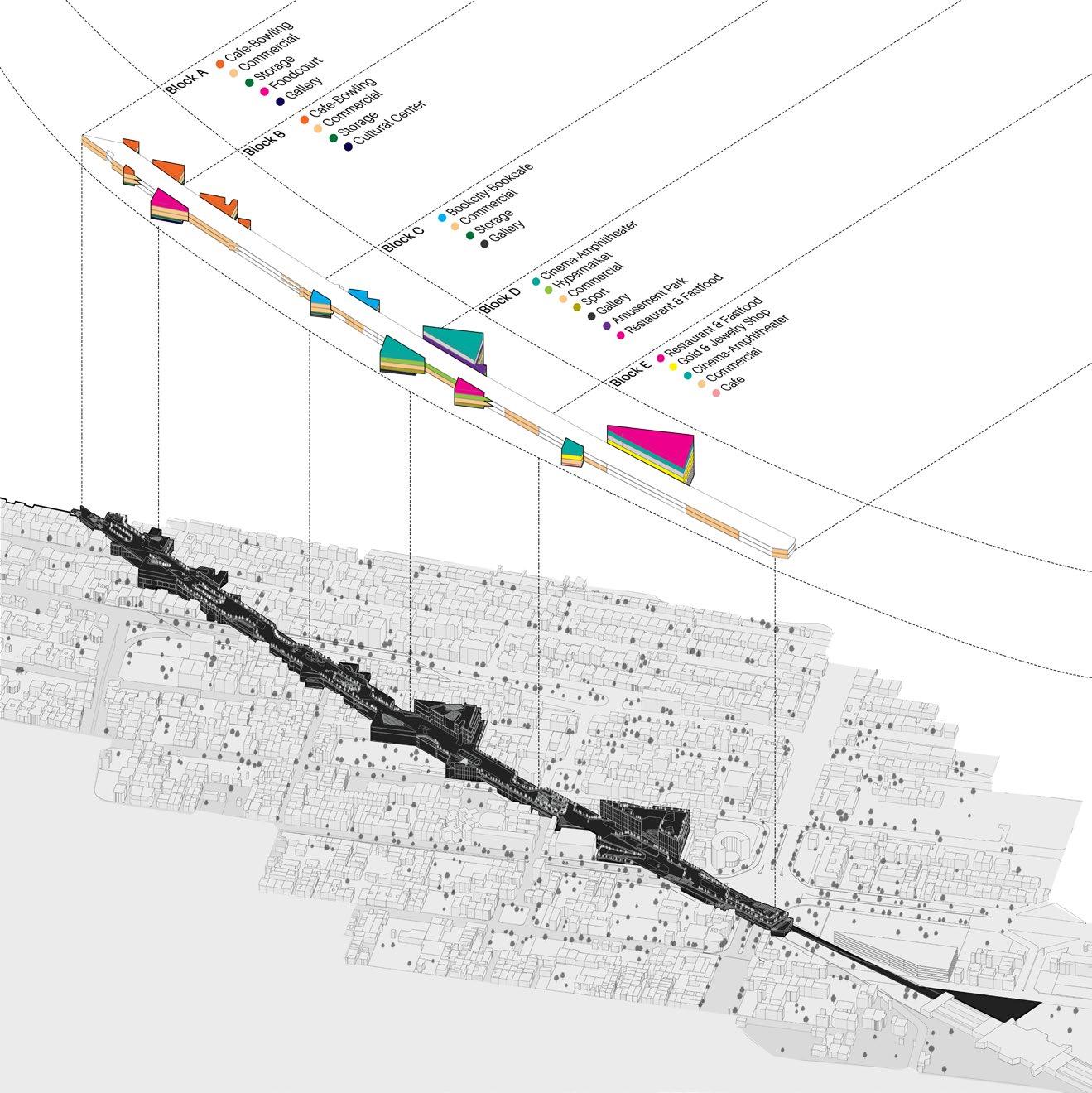The longitudinal axis of the project is divided into a series of smaller blocks welded to each other on a higher level and informed an elongated street. On the borderlines of the road and each block, interstitial areas functioning as several micro-plazas are generated through the subtraction of void spaces.