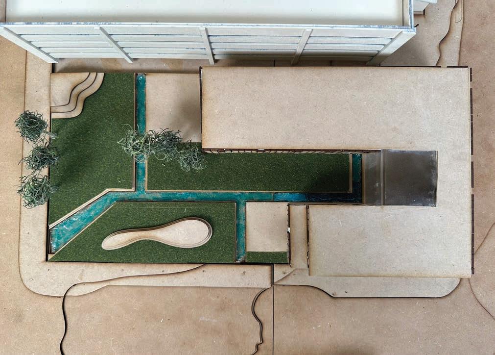 At the site, a green roof with a channel into a bioswale was introduced. Additionally, each pavilion was slightly sloped inward towards the walking path to allow for rainwater to be funneled and filtered one last time before making its way to the river.