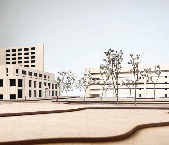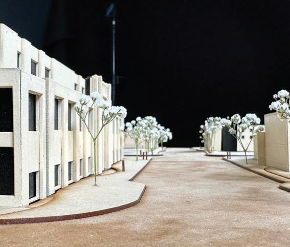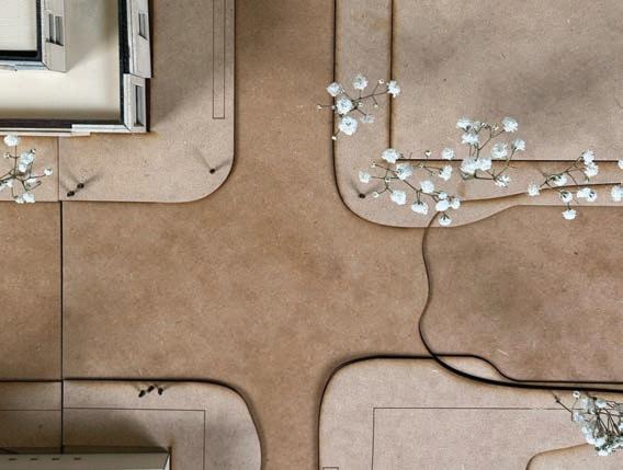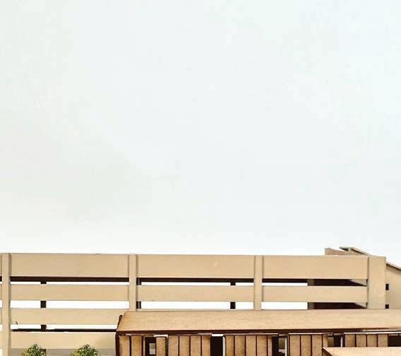 The axonometric drawing o ers a three-dimensional perspective of elements such as the circulation of the roof, inner courtyards, pedestrian paths, flexible juliet balconies, and more.