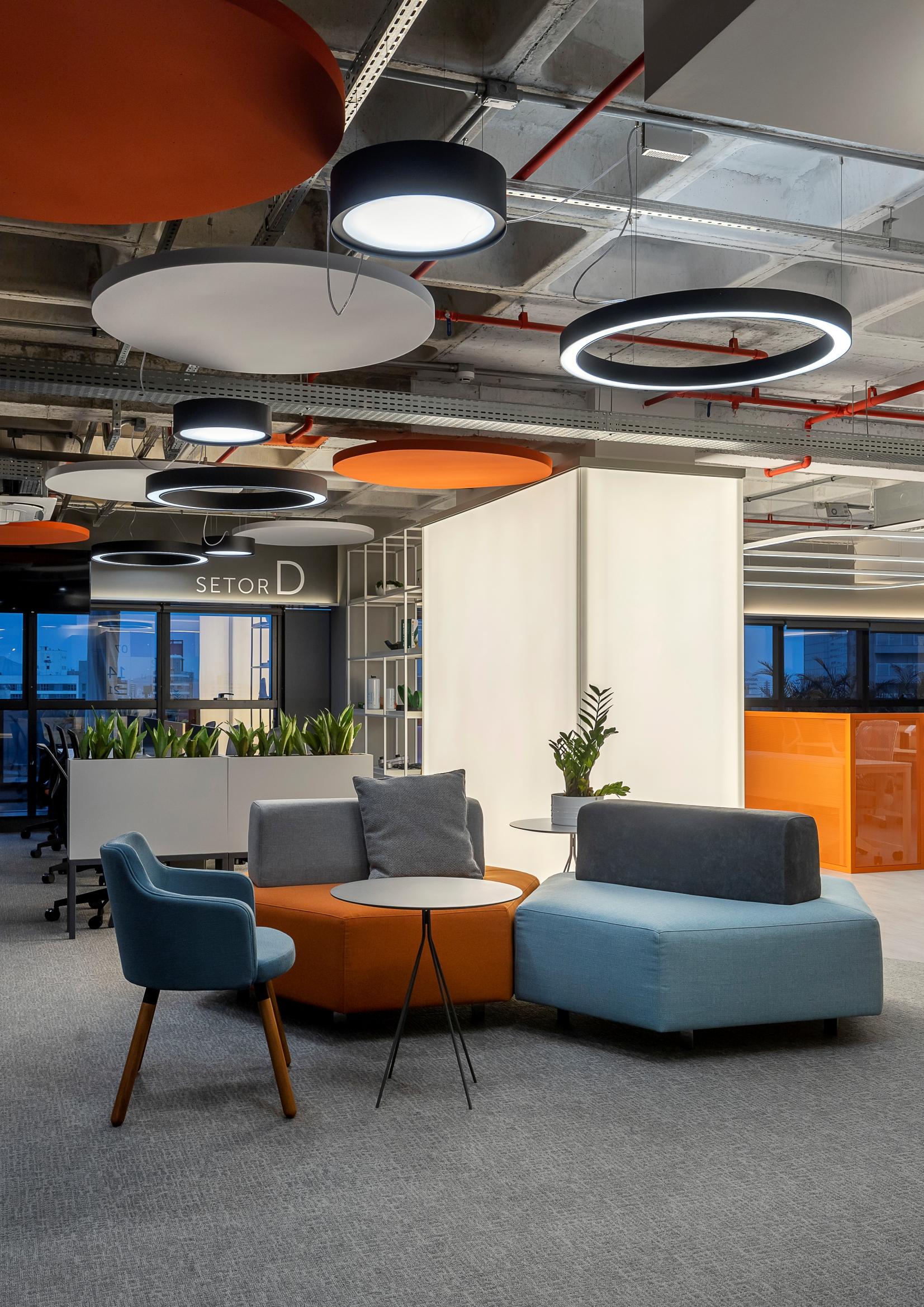 Sendo um espaço muito amplo, foi importante iniciar o conceito do espaço de forma fluída e legível, diluindo as áreas de circulação e, ao mesmo tempo, conectando os ambientes e colaboradores. Buscamos referenciar as cores da marca ao mesmo tempo que fizemos uma composição agradável, divertida e descontraída.