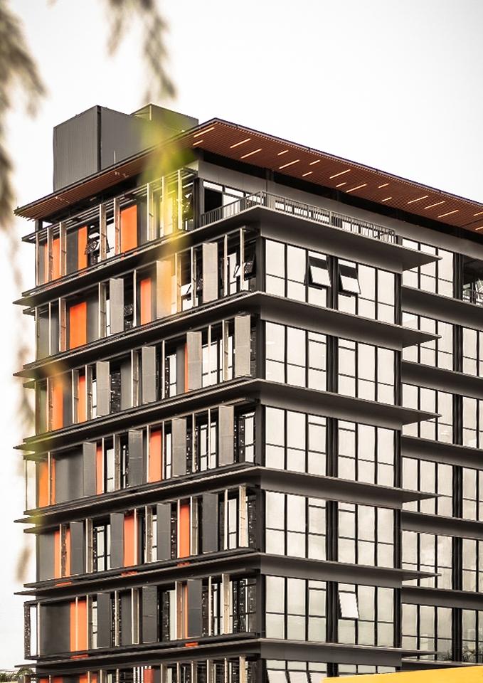 Além de ser um produto altamente tecnológico, que faz uso de sistemas como o de placas fotovoltaicas e de aproveitamento de água da chuva, o partido arquitetônico utilizou estratégias bioclimáticas através de desenhos que aumentam a performance do edifício, alinhando as características construtivas com necessidades de conforto ambiental.