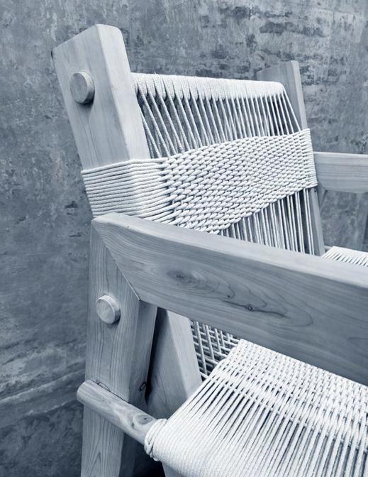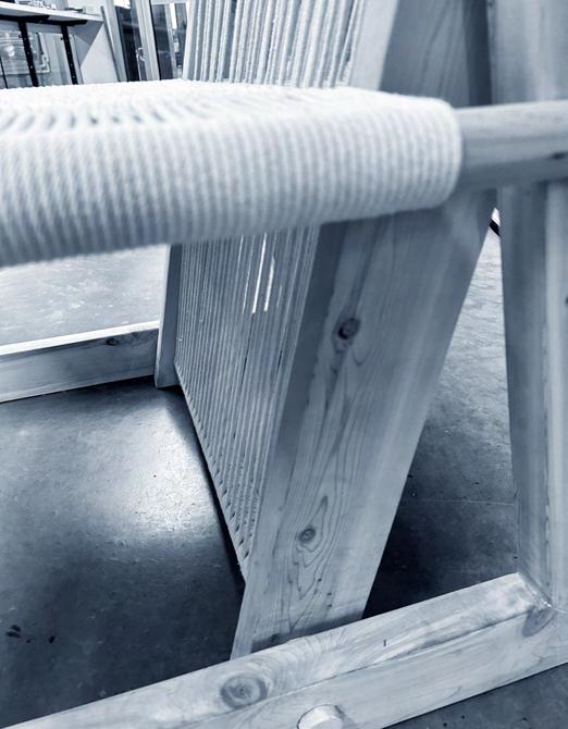 Constructed from eastern white cedar, the design explores Indigenous lashing techniques and biodegradable cord-line weaving to create a loom-like seating surface.