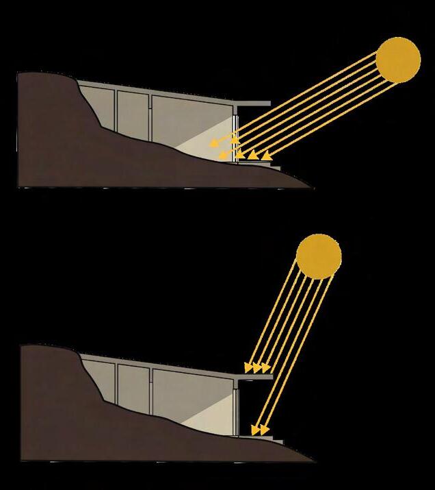 The building is oriented to maximize natural daylight by placing large windows toward the southeast, allowing low winter sun to penetrate deeper into the interior spaces. During summer, the roofoverhang helps block the higher sun angles, reducing excessive solar heat gain while still allowing soft daylight into the building.