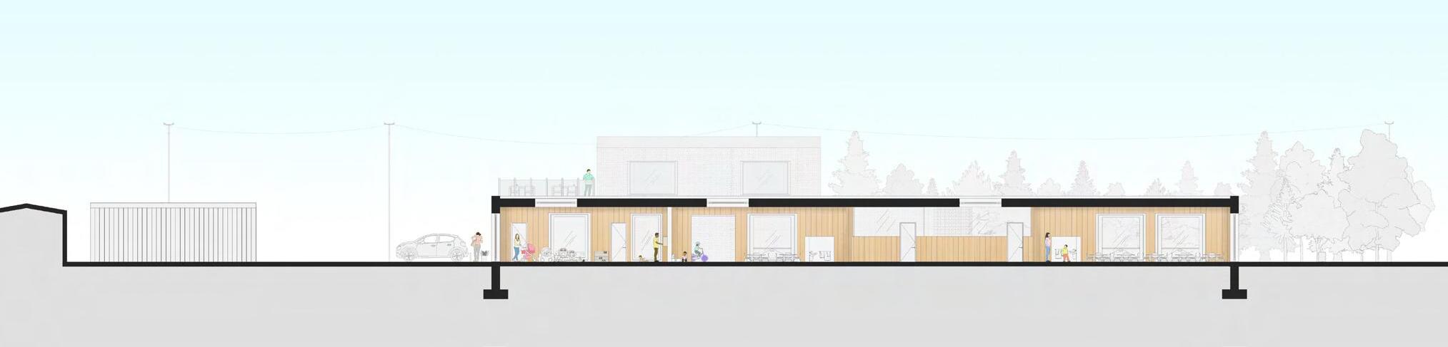 The Early Learning Centre is conceived as a protective and nurturing shelter. Three wings form a U-shaped refuge that embraces the children, shielding them from the noise and chaos of surrounding streets while opening toward light, nature, and spaces for play and exploration
