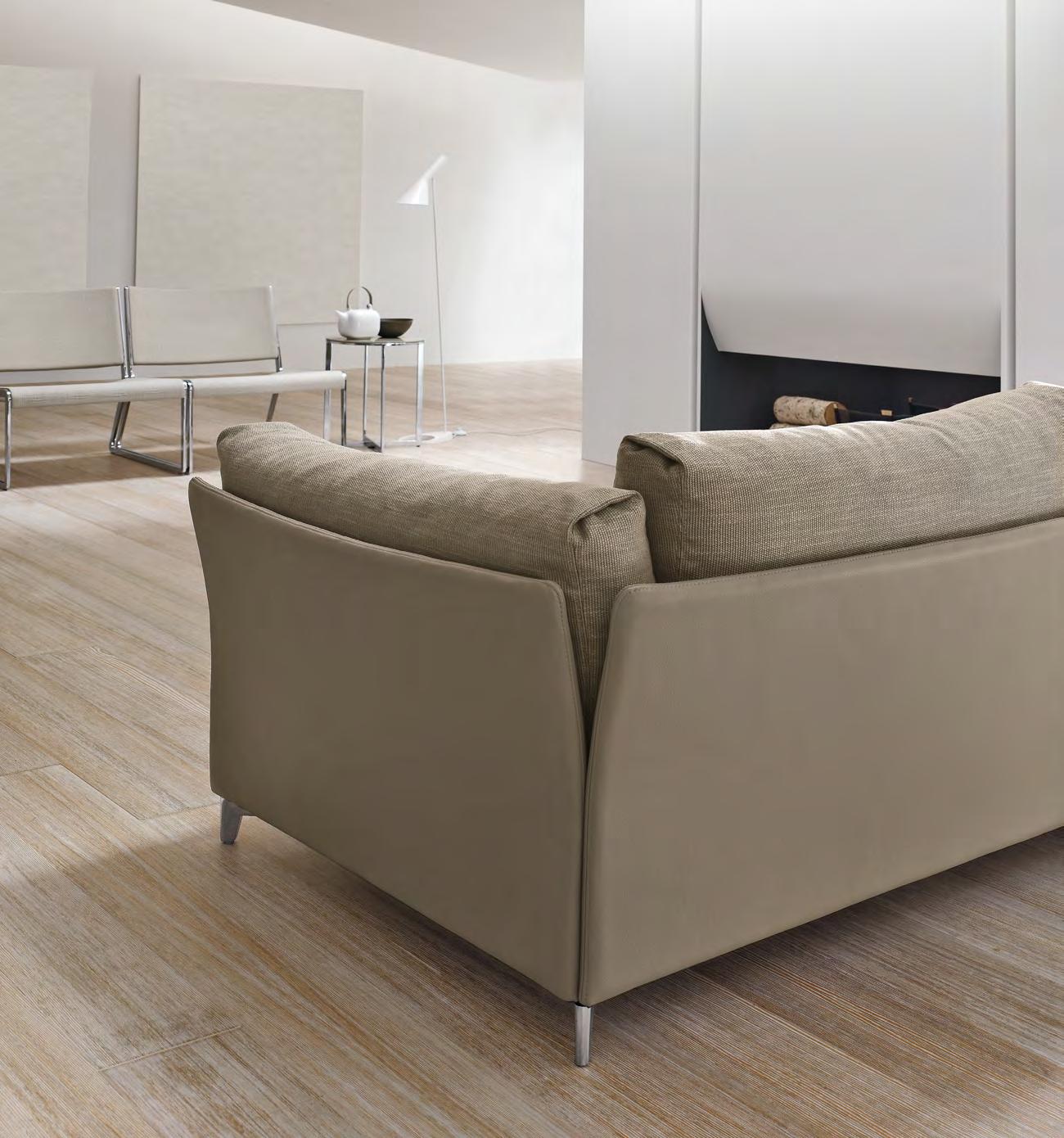I piedini sottili sostengono con leggerezza la solidità del divano e si abbinano perfettamente alla struttura in metallo dei tavolini di servizio Sirio.