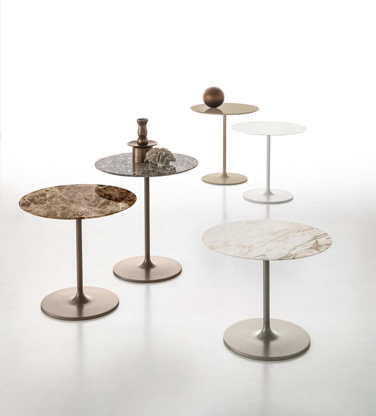 Tavolino. Base in metallo stampata tramite tornitura in lastra, laccata. Piano in marmo o in MDF laccato lucido o opaco.