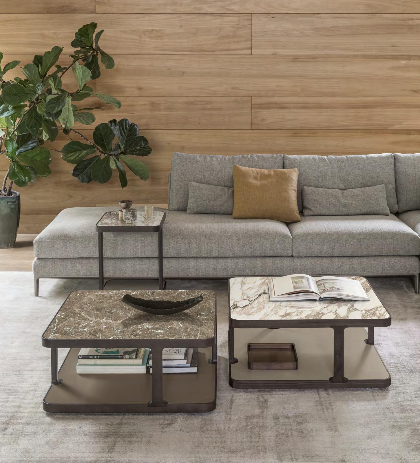 An exclusive and quiet corner. The Edward sofa features ample seats, slender armrests and feet in cast aluminium, with an exclusive design. The Toledo coffee tables complete the relaxation area, also with a side table version built into the sofa.