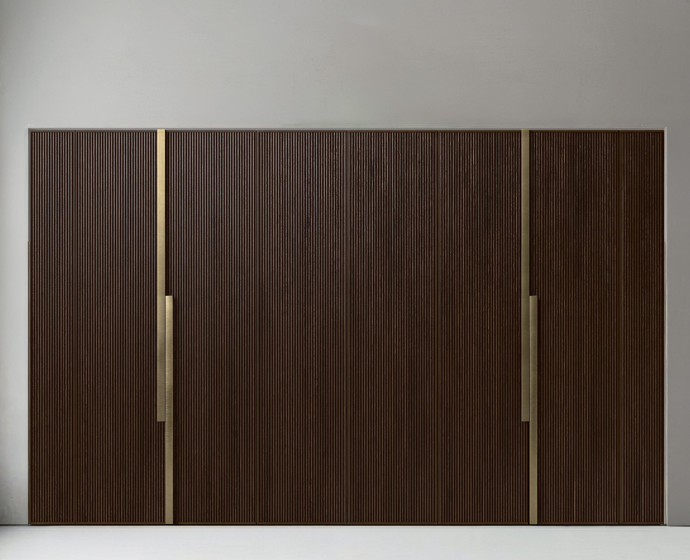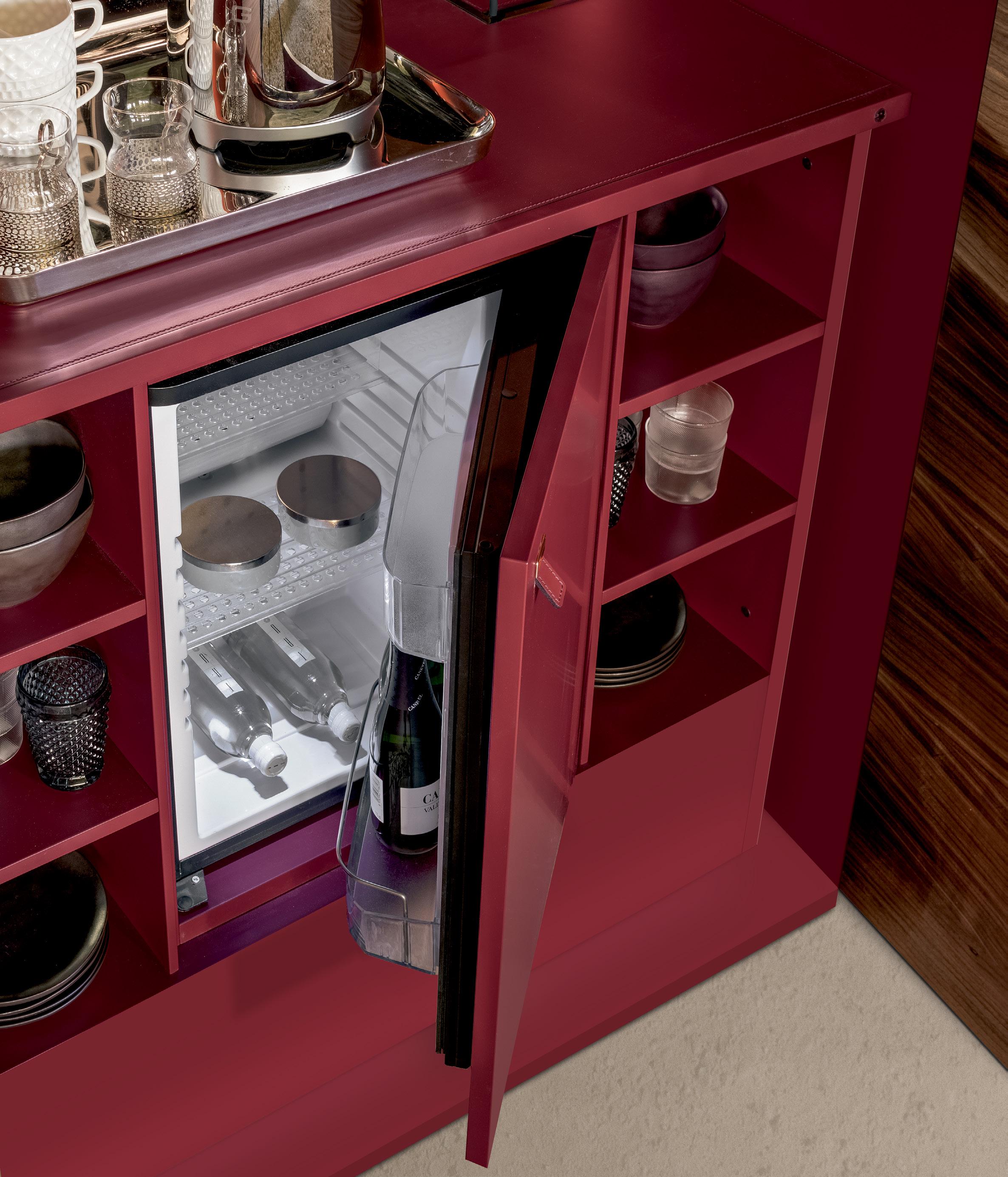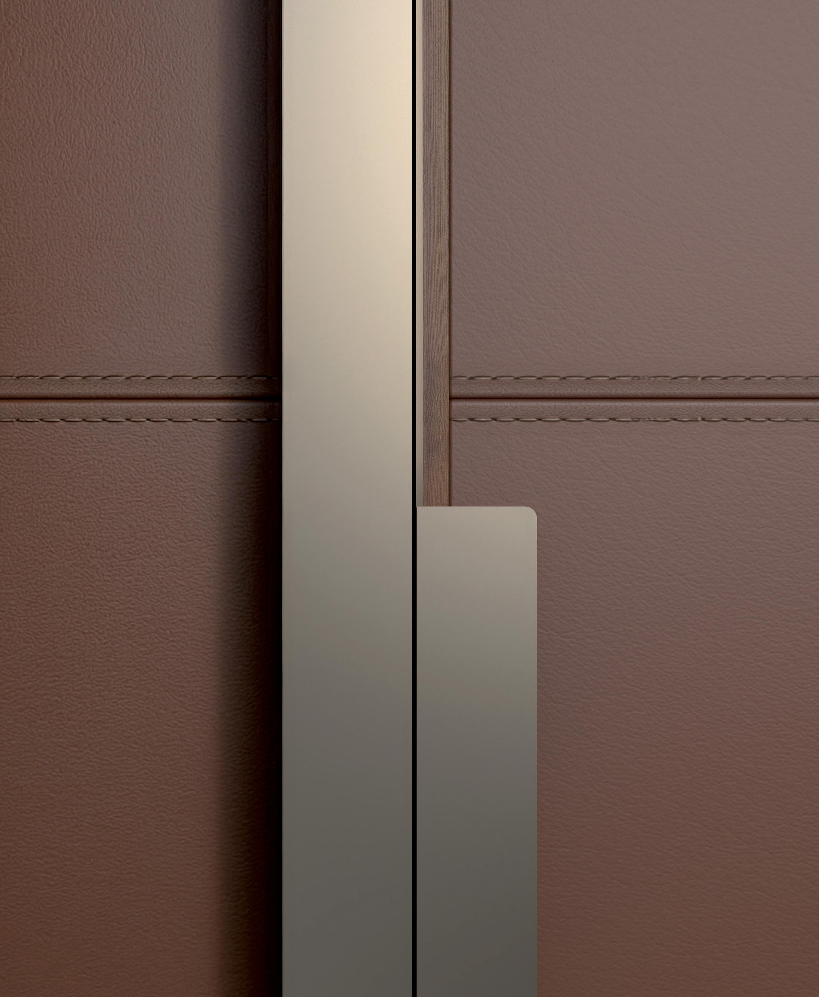 The structures are made of lacquered MDF or solid-color melaminecoated MDF.The doors, featuring a solid Canaletto walnut frame, are available in Canaletto walnut fluted finish, matt lacquer, or hide upholstery enhanced with stitching in a coordinated thread colour. Doors can be opened via a push-pull system or with a decorative painted metal handle.